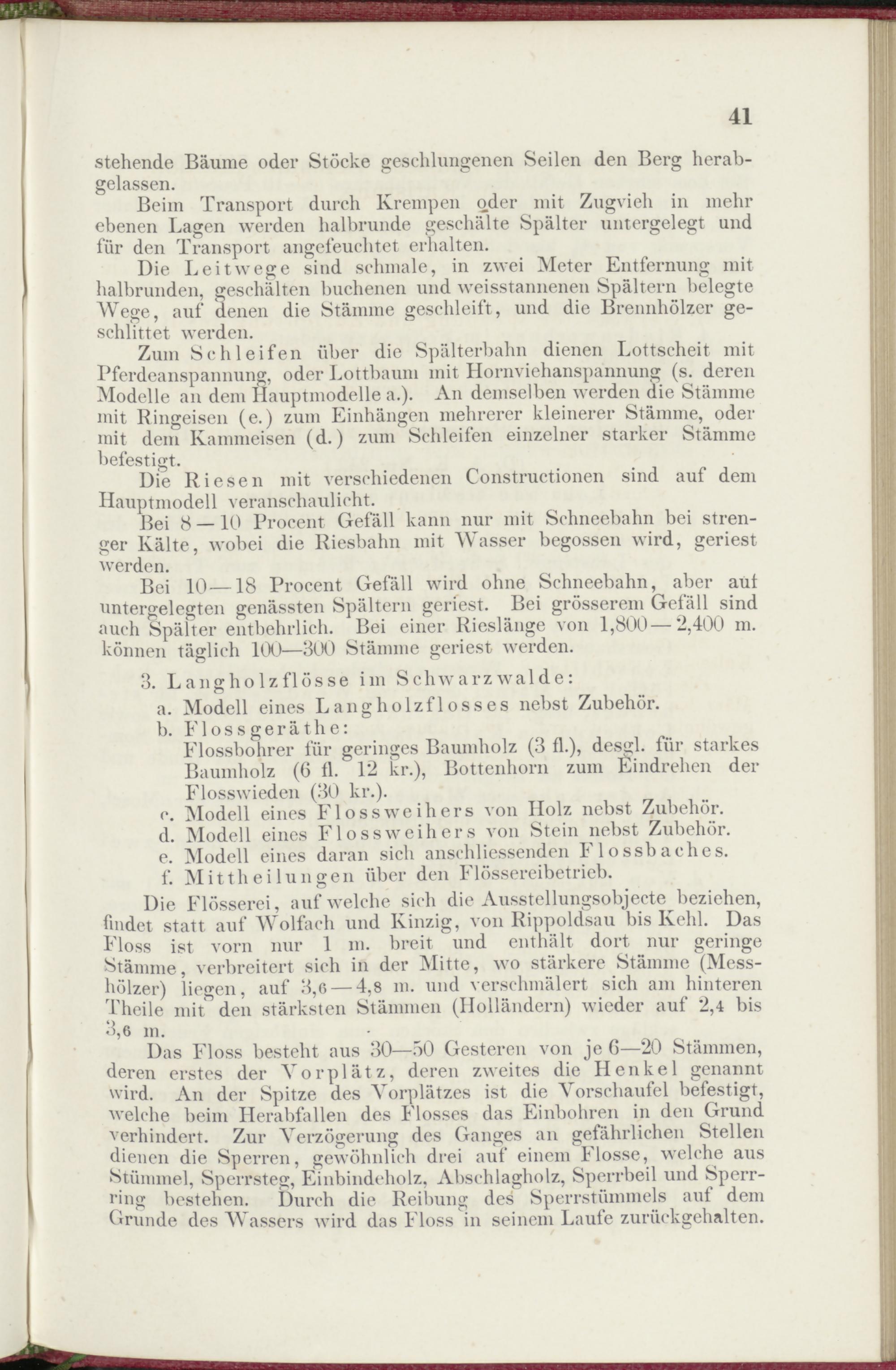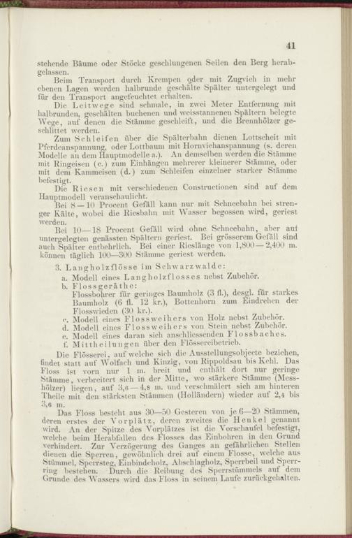 Die Flösserei, auf welche sich die Ausstellungsobjecte beziehen, findet statt auf Wolfach und Kinzig, von Rippoldsau bis Kehl. Das Floss ist vorn mir 1 m. breit und enthält dort nur geringe Stämme, verbreitert sich in der Mitte, wo stärkere Stämme (Messhölzer) liegen, auf 3,6 — 4,8 m. und verschmälert sich am hinteren Theile mit den stärksten Stämmen (Holländern) wieder auf 2,4 bis 3,6 m.