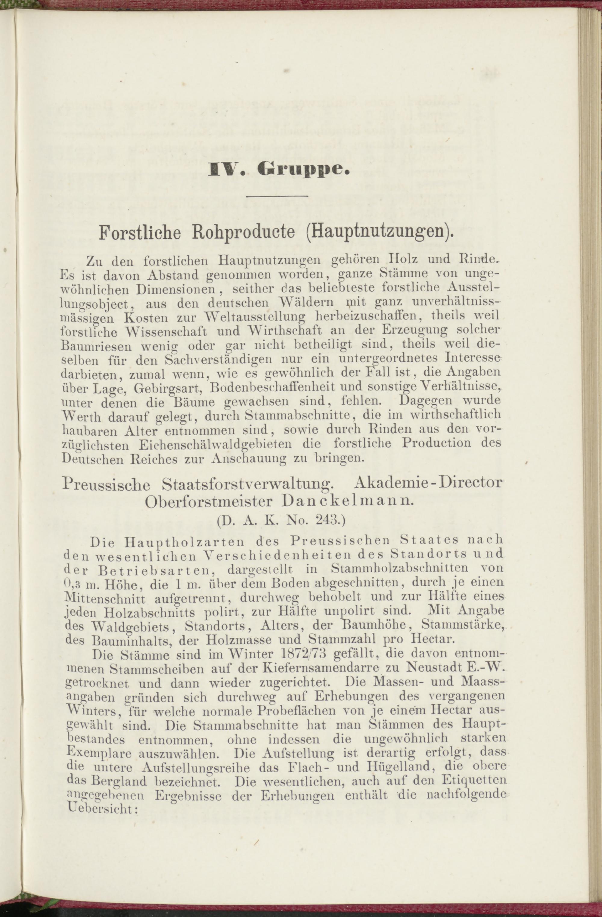 Zu den forstlichen Hauptnutzungen gehören Holz und Rinde. Es ist davon Abstand genommen worden, ganze Stämme von ungewöhnlichen Dimensionen, seither das beliebteste forstliche Ausstellungsobject, aus den deutschen Wäldern ipit ganz unverliältniss- mässigen Kosten zur Weltausstellung herbeizuschaffen, theils weil forstliche Wissenschaft und Wirthschaft an der Erzeugung solcher Baumriesen wenig oder gar nicht betheiligt sind, theils weil dieselben für den Sachverständigen nur ein untergeordnetes Interesse darbieten, zumal wenn, wie es gewöhnlich der Fall ist, die Angaben über Lage, Gebirgsart, Bodenbeschaffenheit und sonstige Verhältnisse, nnter denen die Bäume gewachsen sind, fehlen. Dagegen wurde Werth darauf gelegt, durch Stammabschnitte, die im wirtschaftlich haubaren Alter entnommen sind, sowie durch Rinden aus den vorzüglichsten Eichenschälwaldgebieten die forstliche Production des Deutschen Reiches zur Anschauung zu bringen.
