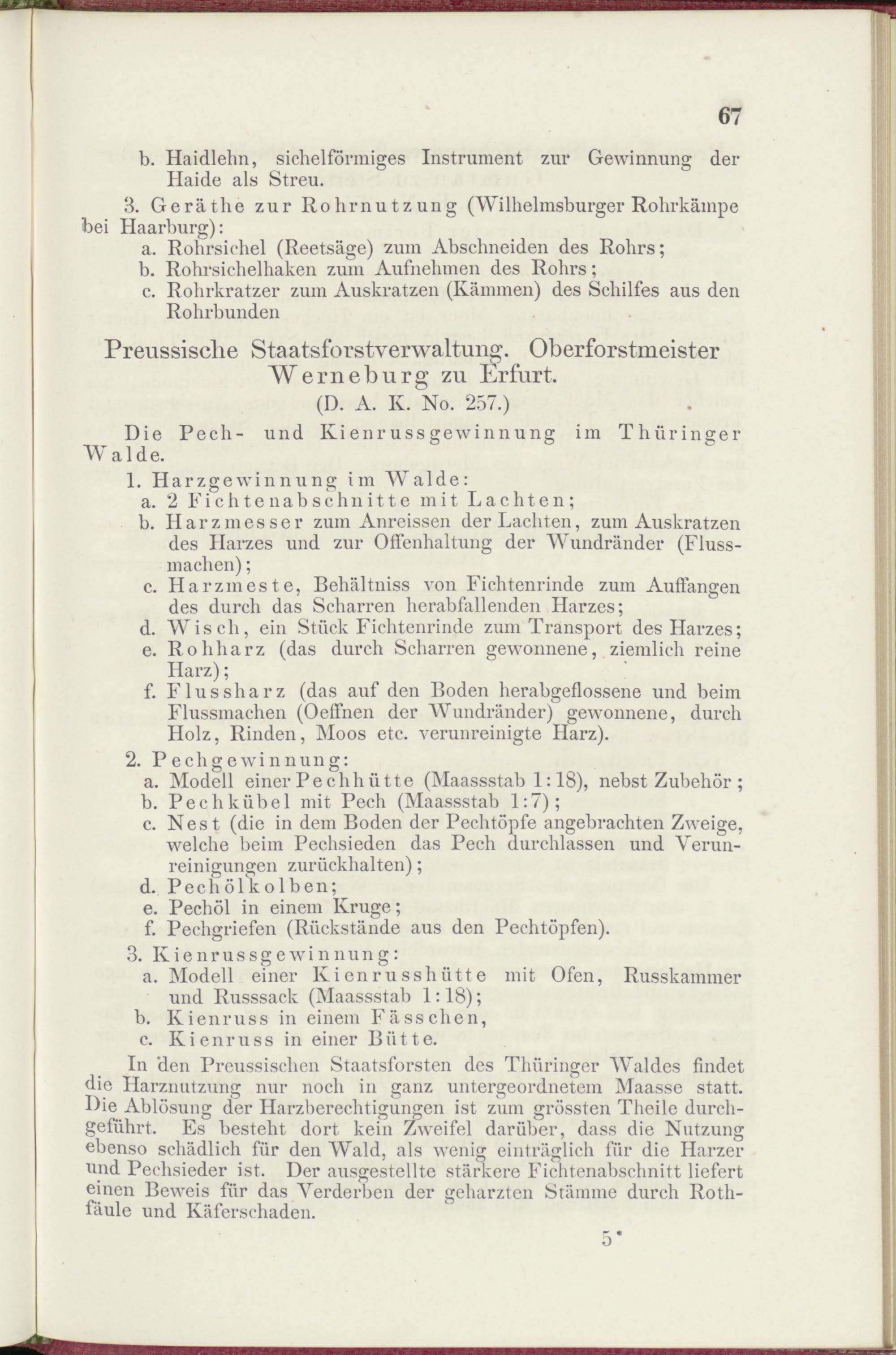In den Preussiselien Staatsforsten des Thüringer Waldes findet die Harzimtzung nur noch in ganz untergeordnetem Maasse statt. Die Ablösung der Harzberechtigungen ist zum grössten Theile durch- geluhrt. Es besteht dort kein Zweifel darüber, dass die Nutzung ebenso schädlich für den Wald, als wenig einträglich für die Harzer und Pechsieder ist. Der ausgestellte stärkere Fichtenabschnitt liefert einen Beweis für das Verderben der geharzten Stämme durch Roth- fäule und Käferschaden.
