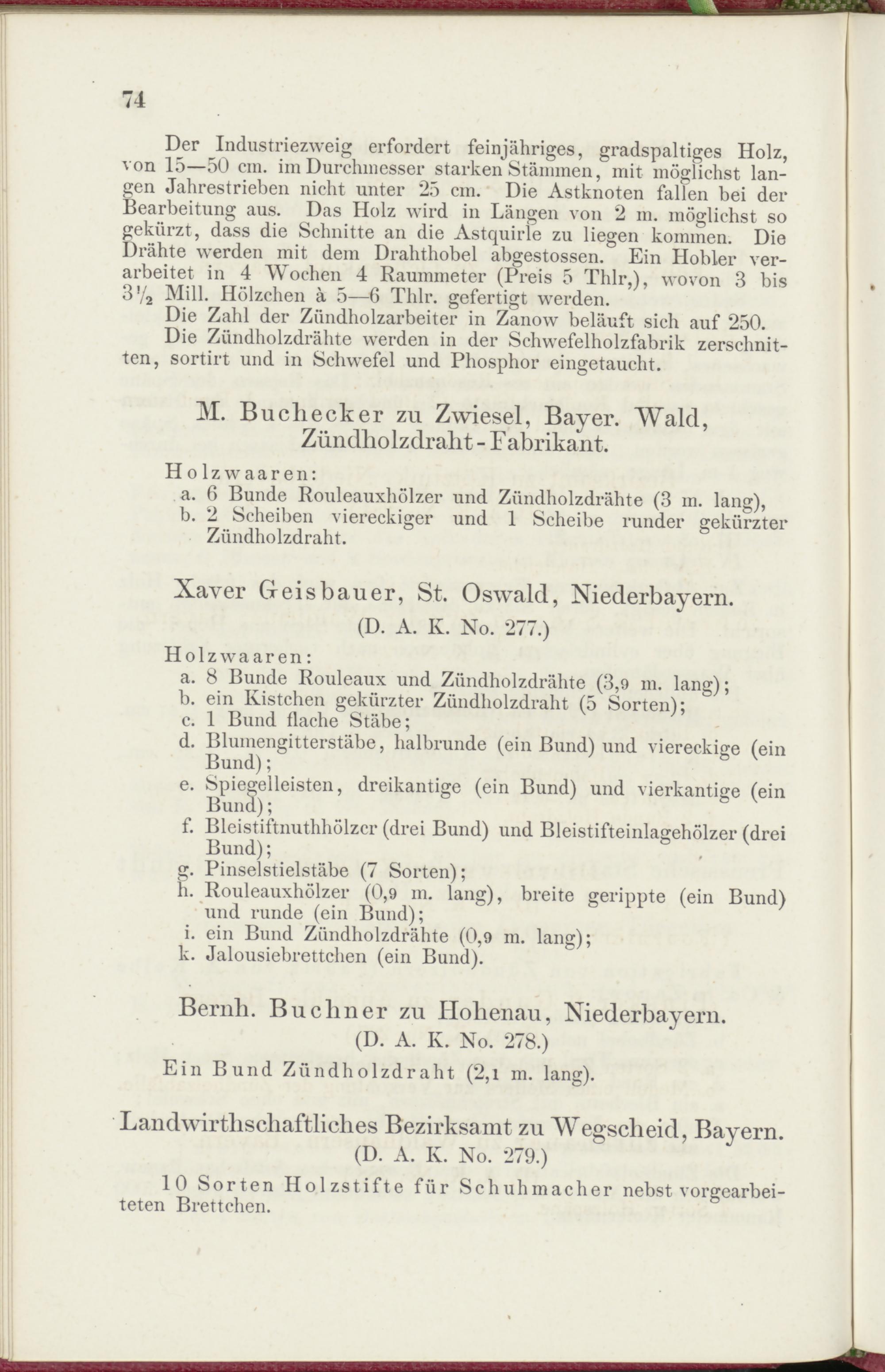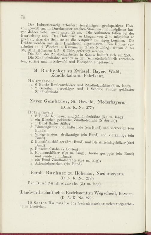 Der Industriezweig erfordert feinjähriges, gradspaltiges Holz, von 15—50 ein. im Durchmesser starken Stämmen, mit möglichst langen Jahrestrieben nicht unter 25 cm. Die Astknoten fallen bei der Bearbeitung aus. Das Holz wird in Längen von 2 m. möglichst so gekürzt, dass die Schnitte an die Astquirle zu liegen kommen. Die Drähte werden mit dem Drahthobel abgestossen. Ein Hobler verarbeitet in 4 Wochen 4 Raummeter (Preis 5 Thlr,), wovon 3 bis 3 ! / 2 Mill. Hölzchen ä 5—6 Thlr. gefertigt werden.