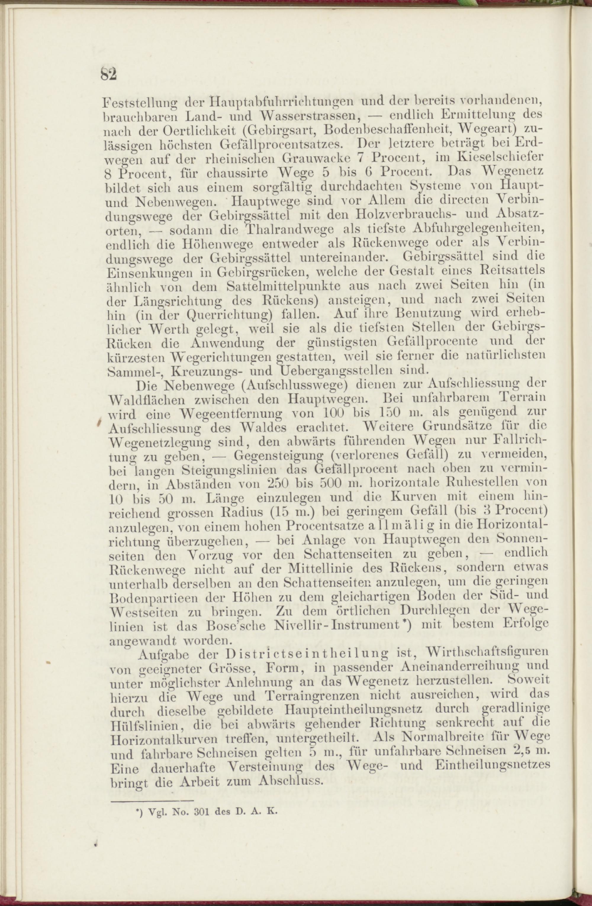Die Nebenwege (Aufschlusswege) dienen zur Aufschliessung der Waldflächen zwischen den Hauptwegen. Bei unfahrbarem Terrain wird eine 'Wegeentfernung von 1ÖU bis 150 m. als genügend zur Aufschliessung des Waldes erachtet. Weitere Grundsätze für die Wegenetzlegung sind, den abwärts führenden Wegen nur Fallrichtung zu geben, — Gegensteigung (verlorenes Gefall) zu vermeiden, bei langen Steigungslinien das Gefallprocent nach oben zu vermindern, in Abständen von 250 bis 500 m. horizontale Ruhestellen von 10 bis 50 m. Länge einzulegen und die Kurven mit einem hinreichend grossen Radius (15 m.) hei geringem Gefall (bis ,‘l Procent) anzulegen, von einem hohen Procentsatze allmälig in die Horizontalrichtung überzugehen, — bei Anlage von Hauptwegen den Sonnenseiten den Vorzug vor den Schattenseiten zu geben, — endlich Rückenwegje nicht auf der Mittellinie des Rückens, sondern etwas unterhalb derselben an den Schattenseiten anzulegen, um die geringen Bodenpartieen der Höhen zu dem gleichartigen Boden der Süd- und Westseiten zu bringen. Zu dem örtlichen Durchlegen der Wege- linien ist das Bose’sehe Nivellir-Instrument *) mit bestem Erfolge angewandt worden.