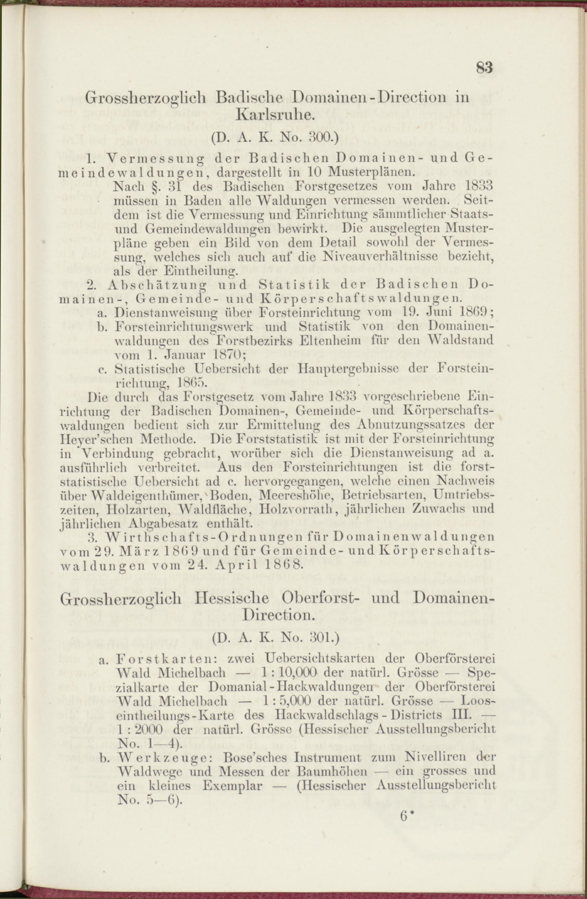 Nach §. 31 des Badischen Forstgesetzes vom Jahre 1833 müssen in Baden alle Waldungen vermessen werden. Seitdem ist die Vermessung und Einrichtung sämmtlicher Staatsund Gemeindewaldungen bewirkt. Die ausgelegten Musterpläne geben ein Bild von dem Detail sowohl der Vermessung, welches sich auch auf die Niveauverhältnisse bezieht, als der Eintheilung.