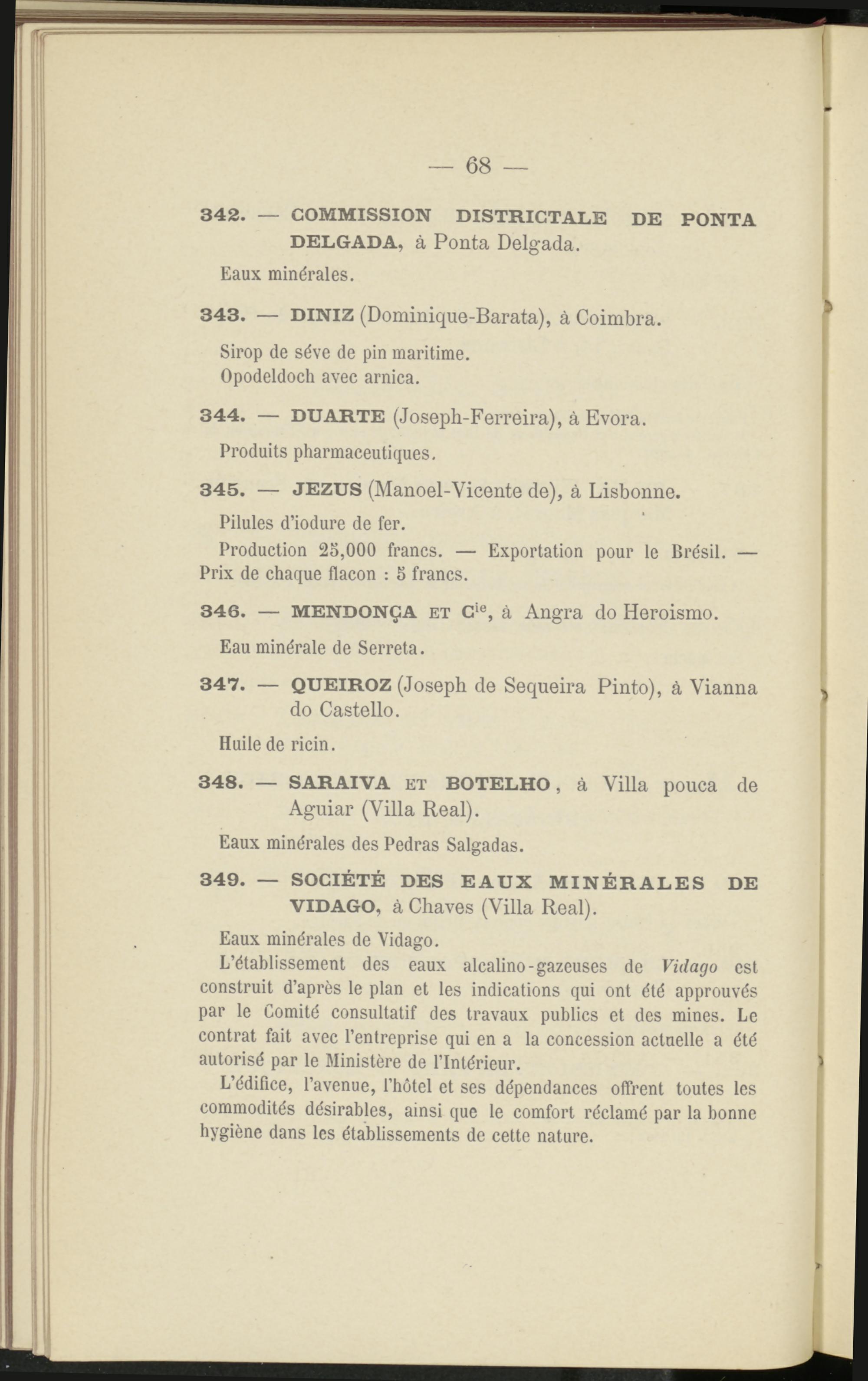 L’établissement des eaux alcalino-gazeuses de Vidago est construit d’après le plan et les indications qui ont été approuvés par le Comité consultatif des travaux publics et des mines. Le contrat fait avec l’entreprise qui en a la concession actuelle a été autorisé par le Ministère de l’Intérieur.