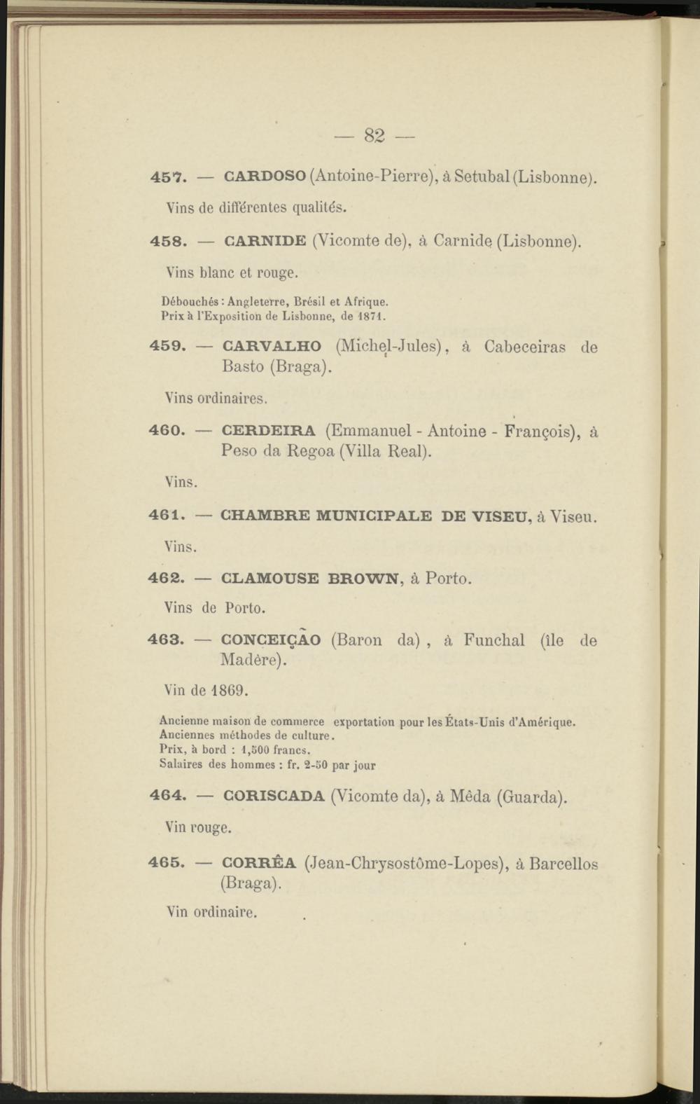 458. — CARNIDE (Vicomte de), à Carnide (Lisbonne). Vins blanc et rouge.