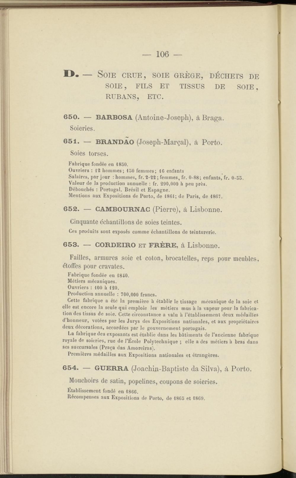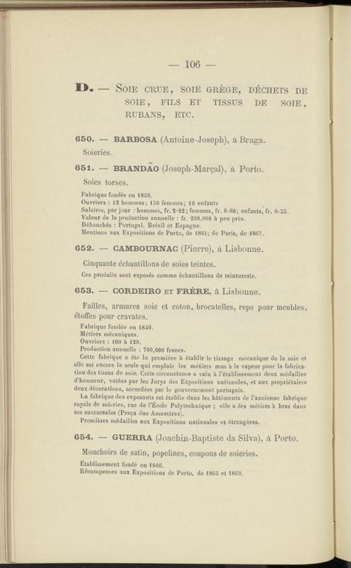 Cette fabrique a été la première b établir le tissage mécanique de la soie et elle est encore la seule qui emploie les métiers mus h la vapeur pour la fabrication des tissus de soie. Cette circonstance a valu h l’établissement deux médailles d’honneur, votées par les Jurys des Expositions nationales, et aux propriétaires deux décorations, accordées par le gouvernement portugais.