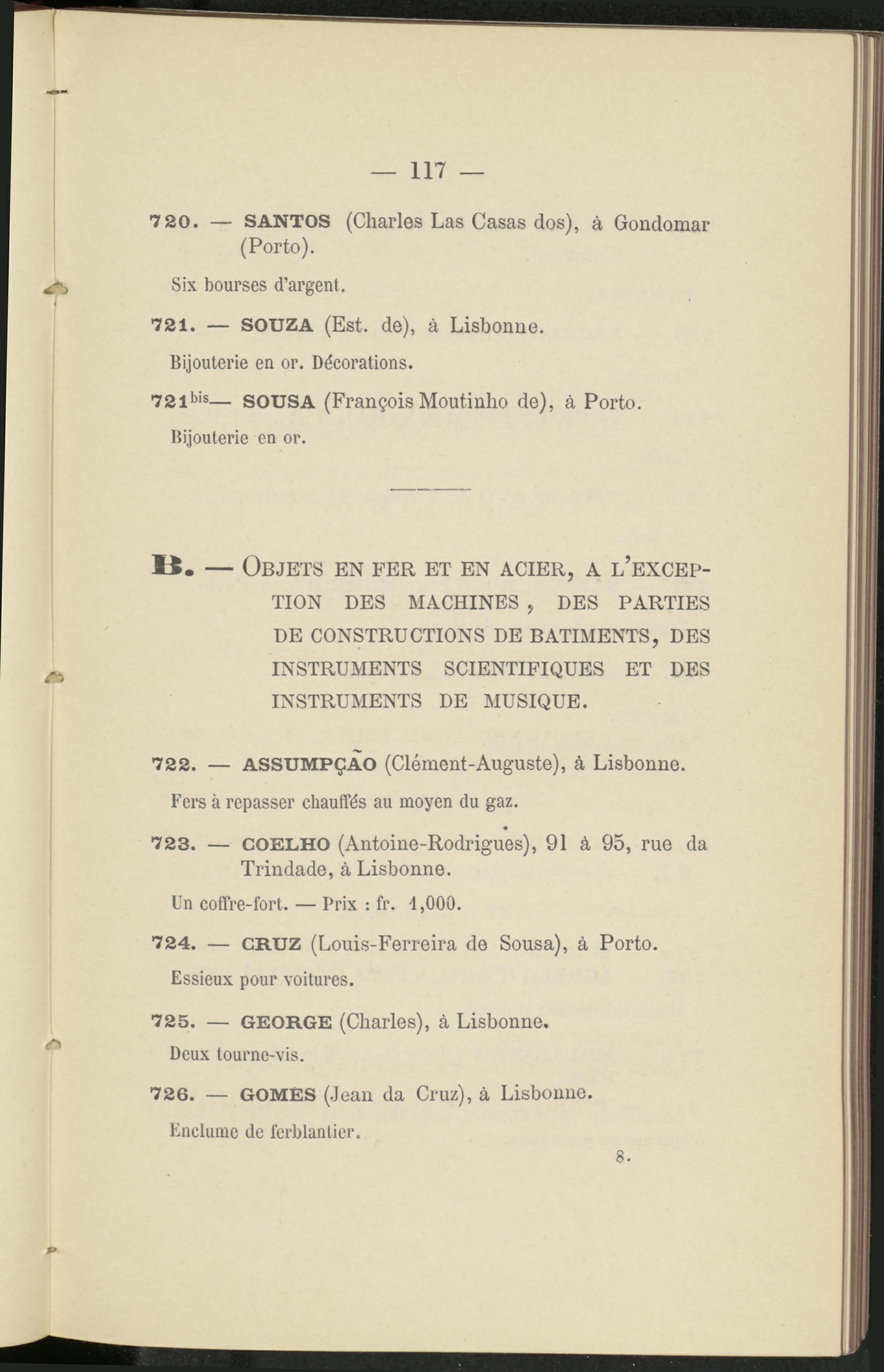 722. — ASSUMPÇAO (Clément-Auguste), à Lisbonne. Fers à repasser chauffés au moyen du gaz.