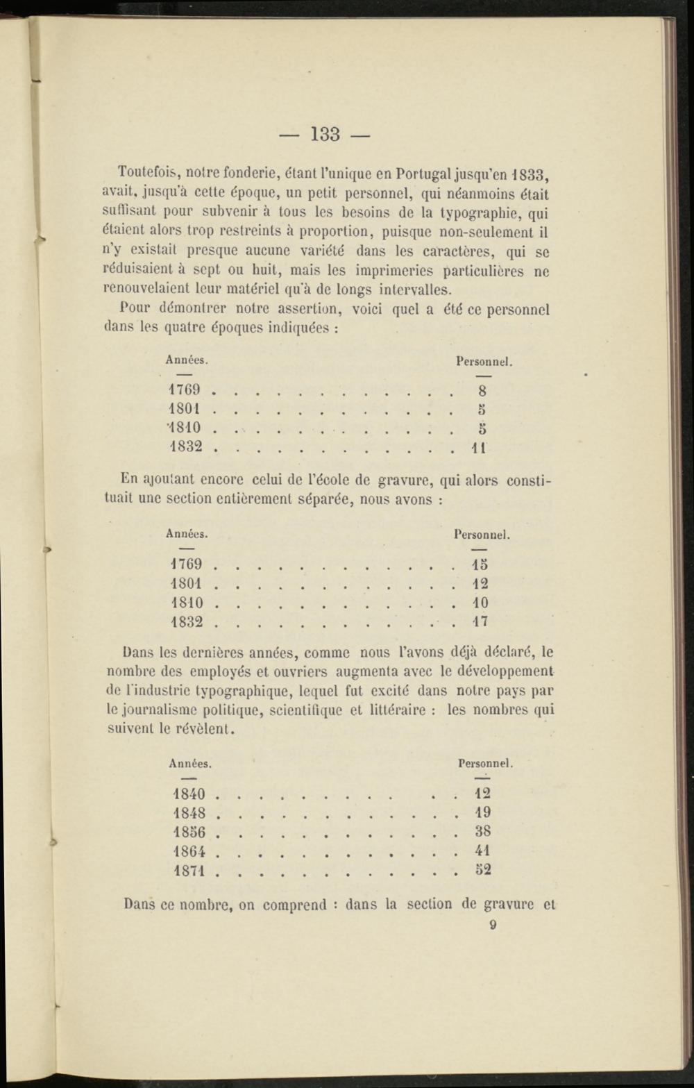 Toutefois, notre fonderie, étant l’unique en Portugal jusqu’en 1833, avait, jusqu’à cette époque, un petit personnel, qui néanmoins était suffisant pour subvenir à tous les besoins de la typographie, qui étaient alors trop restreints à proportion, puisque non-seulement il n’y existait presque aucune variété dans les caractères, qui se réduisaient à sept ou huit, mais les imprimeries particulières ne renouvelaient leur matériel qu'à de longs intervalles.