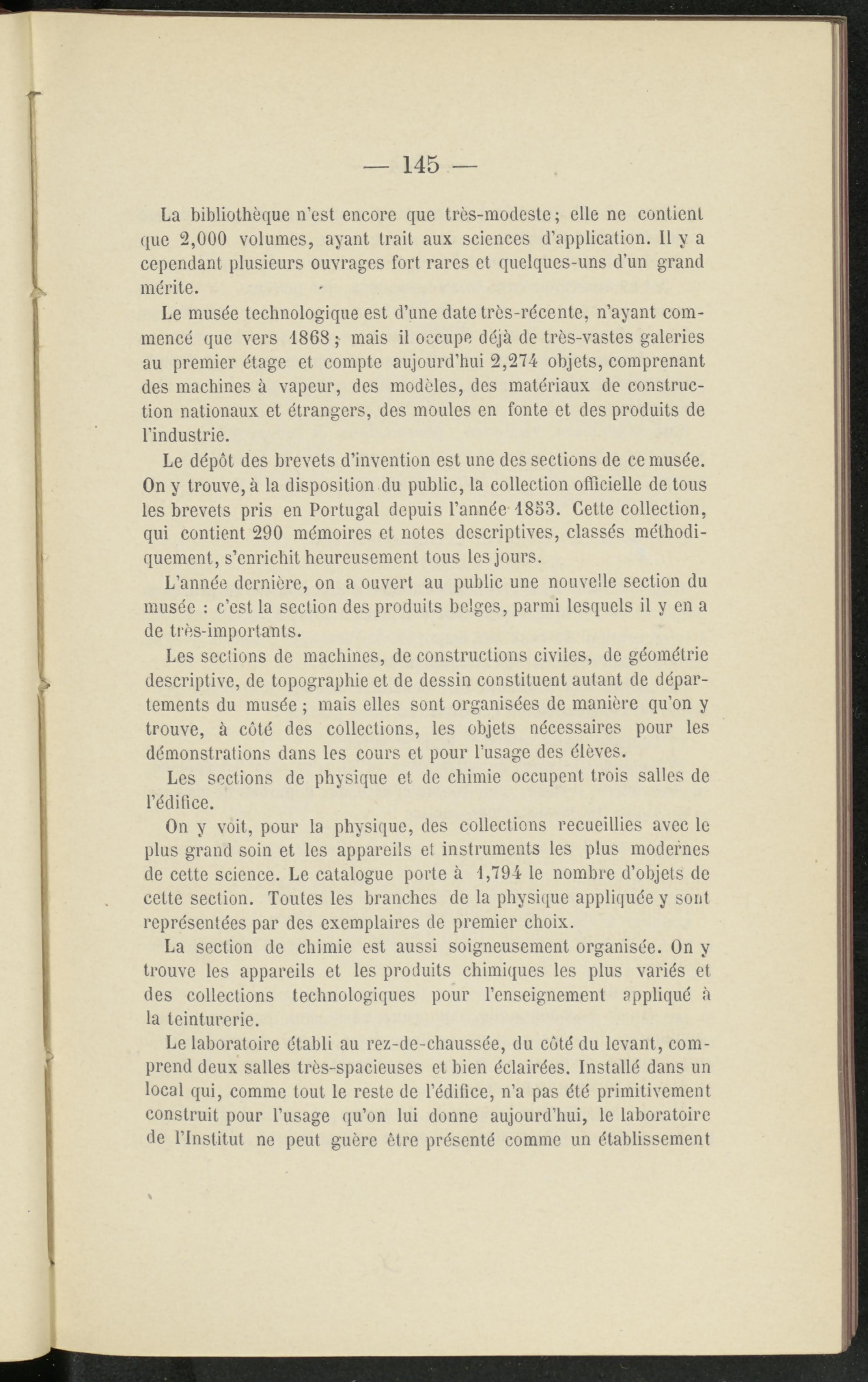 Le dépôt des brevets d’invention est une des sections de ce musée. On y trouve, à la disposition du public, la collection officielle de tous les brevets pris en Portugal depuis l’année 1853. Cette collection, qui contient 290 mémoires et notes descriptives, classés méthodiquement, s’enrichit heureusement tous les jours.