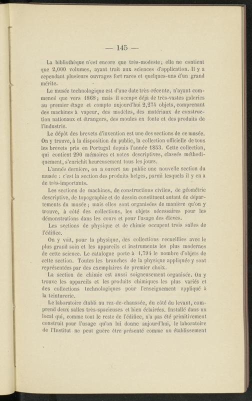 La bibliothèque n’est encore que très-modeste ; elle ne contient que 2,000 volumes, ayant trait aux sciences d’application. 11 y a cependant plusieurs ouvrages fort rares et quelques-uns d’un grand mérite.