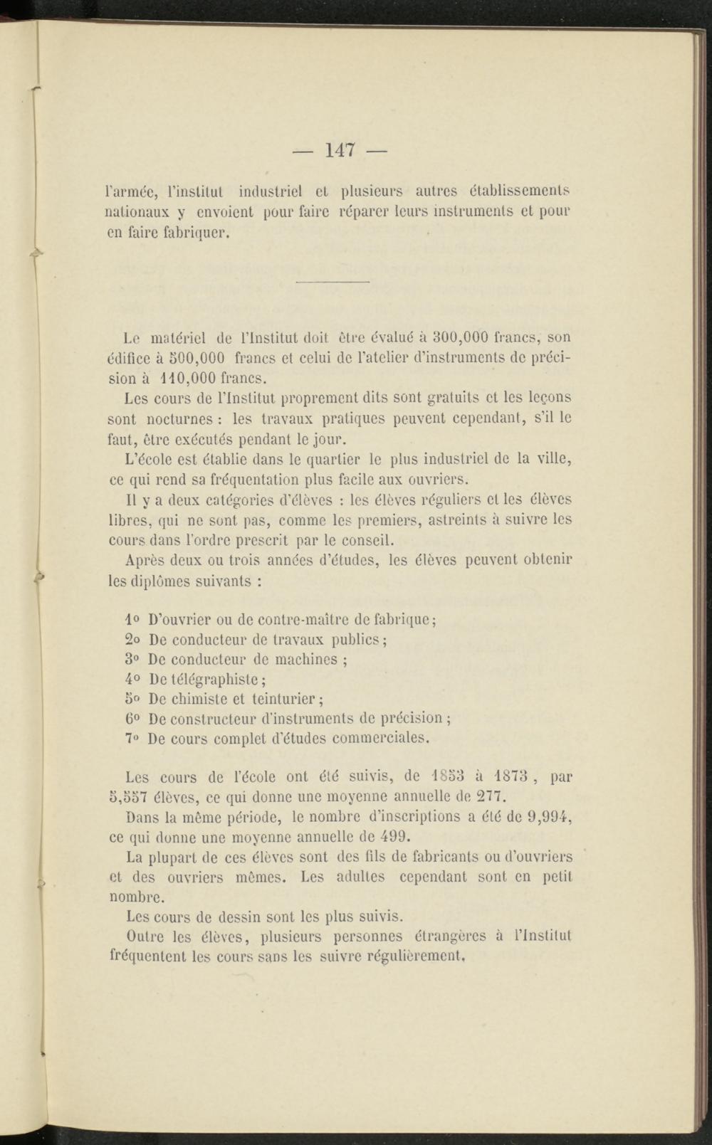Les cours de l’école ont été suivis, de 1853 à 1873 , par 5,557 élèves, ce qui donne une moyenne annuelle de 277.