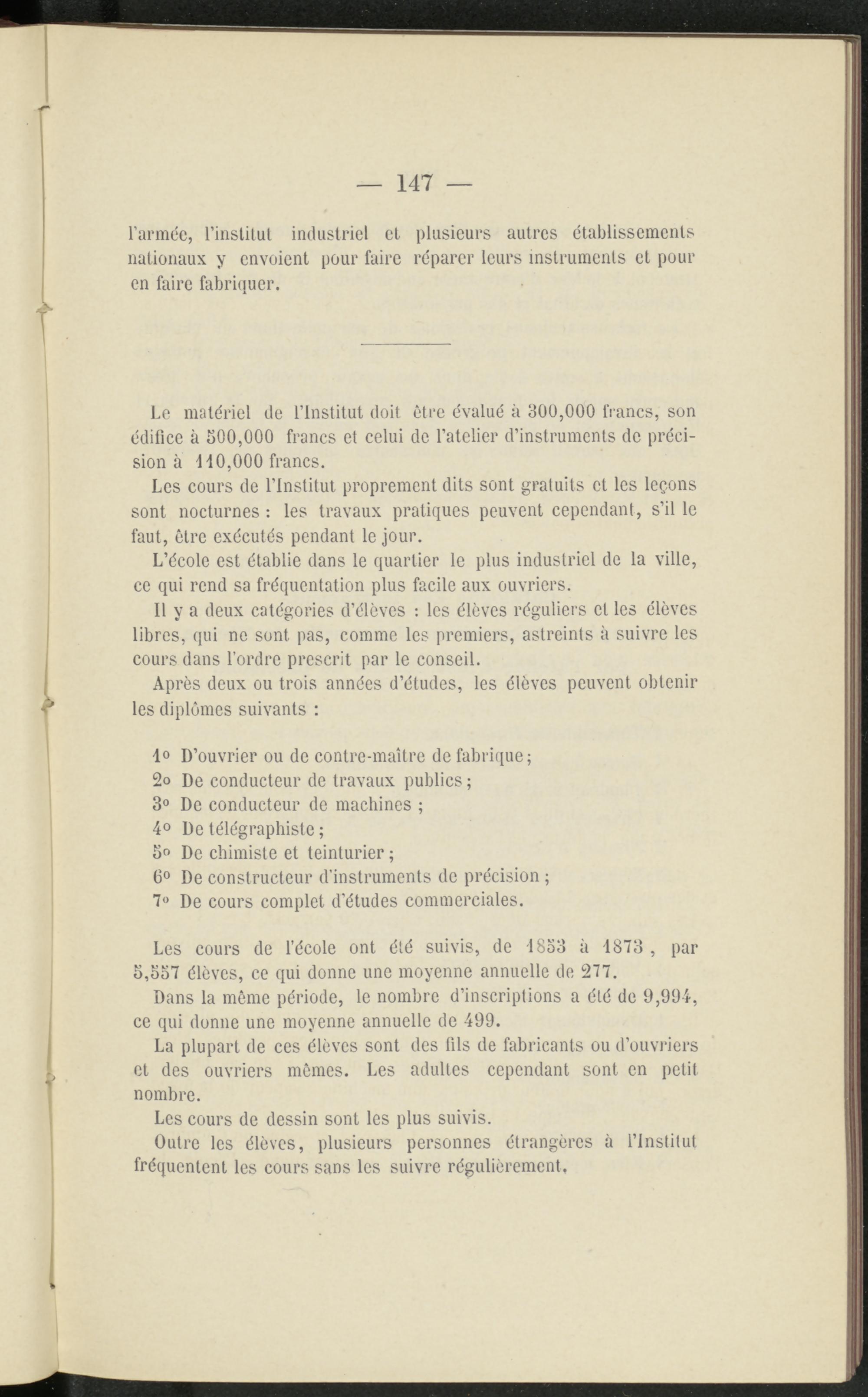 Le matériel de l’Institut doit être évalué à 300,000 li anes, son édifice à 500,000 francs et celui de l’atelier d’instruments de précision à -H0,000 francs.