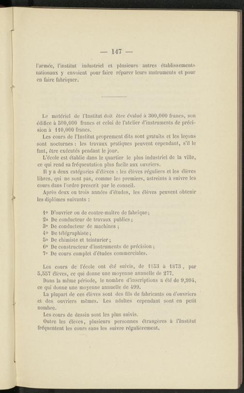 Les cours de l’Institut proprement dits sont gratuits et les leçons sont nocturnes : les travaux pratiques peuvent cependant, s’il le faut, être exécutés pendant le jour.