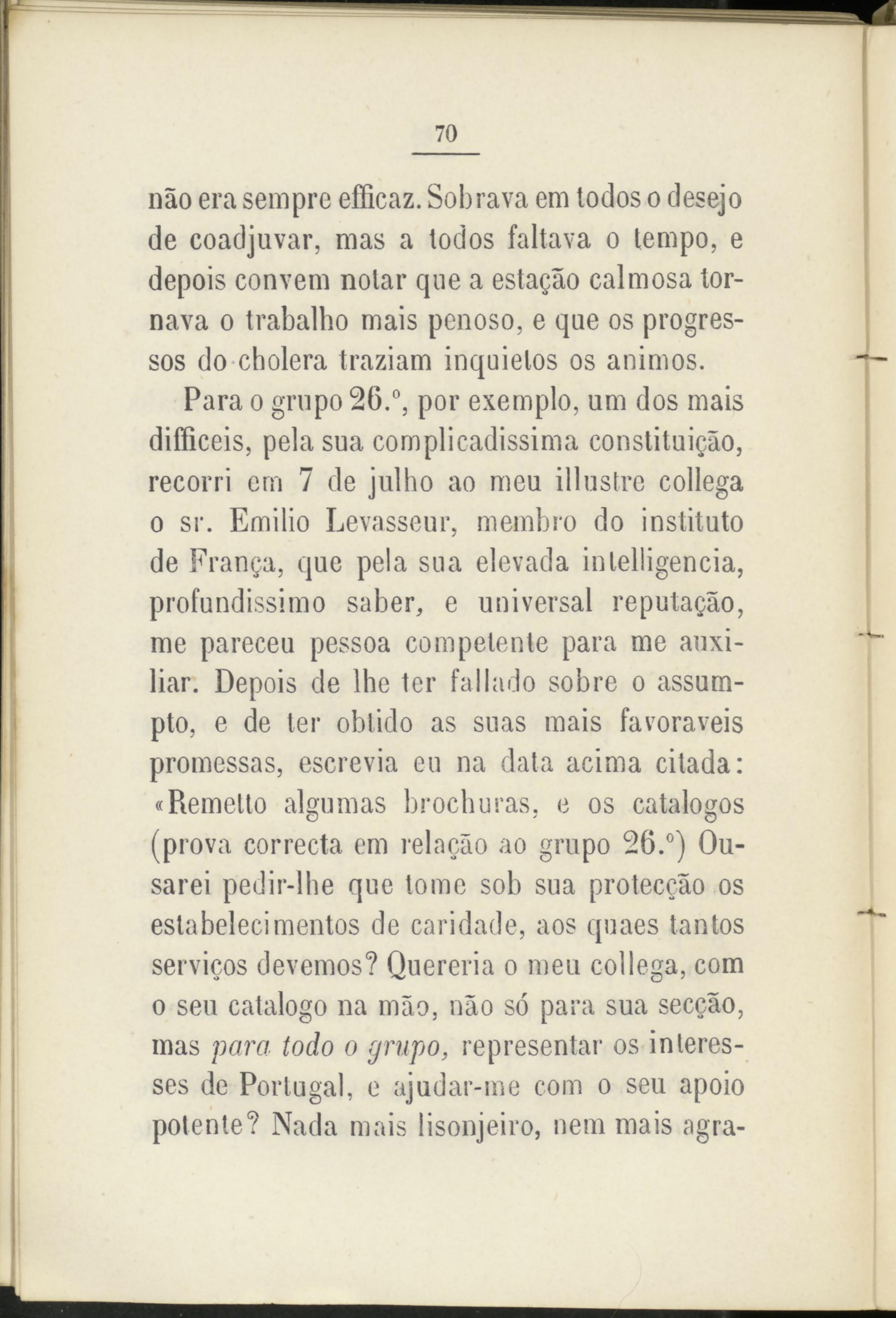 Para o grupo 26.°, por exemplo, um dos mais diíficeis, pela sua complicadissima constituigao, recorri crn 7 de julho ao meu illustrc collega o sr. Emilio Levasseur, membro do instituto de Franga, que pela sua elevada intelligencia, profundísimo saber, e universal reputagáo, me pareceu pessoa competente para me auxiliar. Depois de lhe ter fallado sobre o assum- pto, e de ter oblido as suas mais favoraveis promessas, escrevia eu na data acima citada: «Remetto algumas brochuras. e os catálogos (prova correcta em relagáo ao grupo 26.°) Ou- sarei pedir-lhe que tome sob sua protecgáo os eslabelecimentos de caridade, aos quaes tantos servigos devemos? Quereria o meu collega, com o sen catalogo na máo, nao só para sua secgao, mas para todo o grupo, representar os interes- ses de Portugal, e ajudar-me com o seu apoio potente? Nada mais lisonjeiro, nem mais agra-
