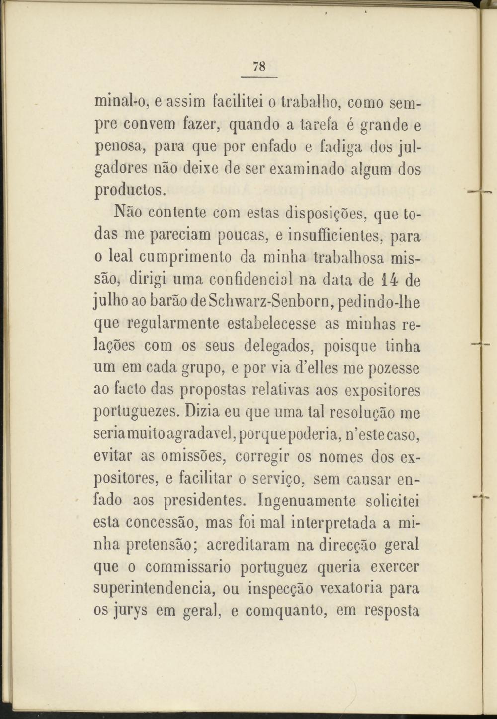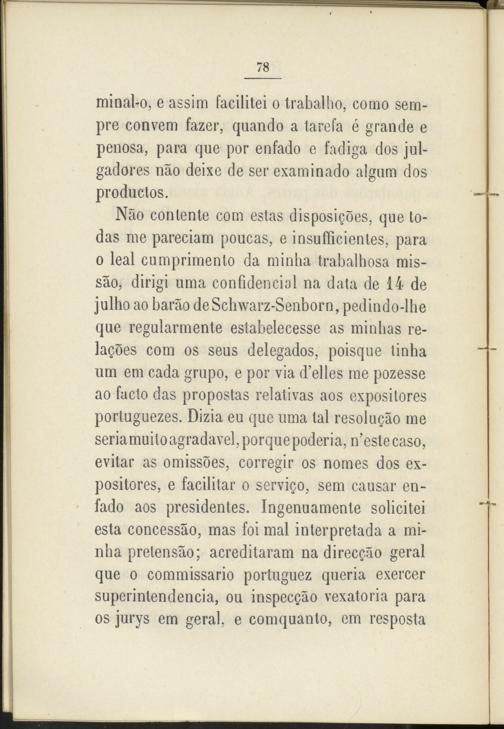 Nao contente com estas disposigoes, que todas me pareciam poucas, e insufficienles, para o leal eumprimento da minha trabalhosa mis- sao, dirigi urna confidencial na data de 14 de julho ao baráo deSchwarz-Senborn, pedindo-lhe que regularmente estabelecesse as minhas re- lagoes com os seus delegados, poisque tinha um em cada grupo, e por via d’elles me pozesse ao facto das propostas relativas aos expositores portuguezes. Dizia eu que urna tal resolugao me seriamuitoagradavel, porque poderia, n’cstecaso, evitar as omissoes, corregir os nomes dos expositores, e facilitar o servico, sem causar enfado aos presidentes. Ingenuamente solicitei esta concessáo, mas foi mal interpretada a minha preten sao; acreditaram na direcgao geral que o commissario portuguez queria exercer superintendencia, ou inspecgáo vexatoria para os jurys em geral, e comquanto, em resposta