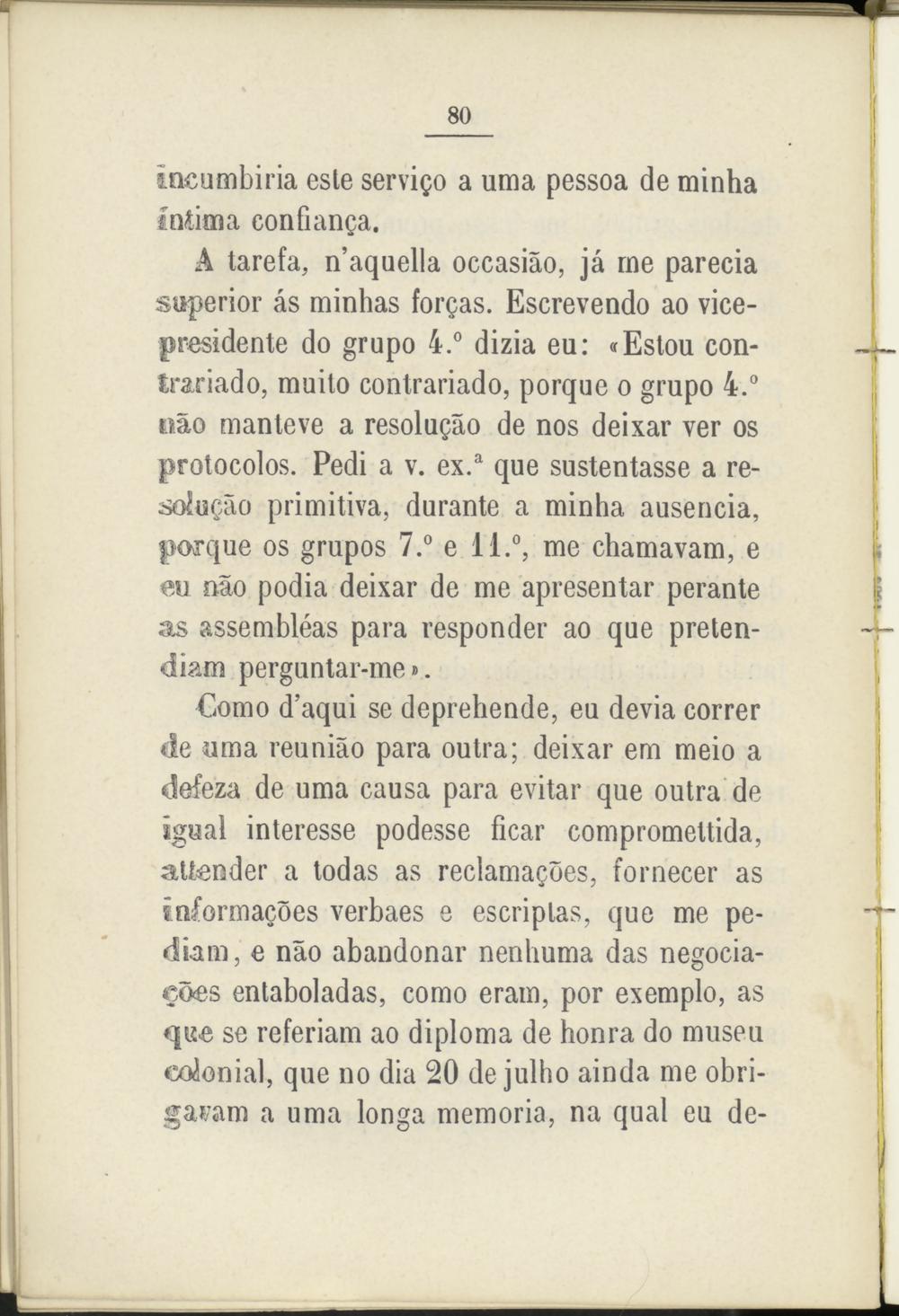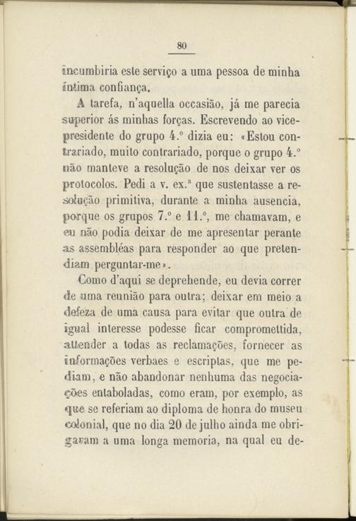 A tarefa, n’aquella occasiao, já me parecía superior ás minhas forgas. Escrevendo ao vicepresidente do grupo 4.° dizia eu: «Estou contrariado, muilo contrariado, porque o grupo 4.° nao manteve a resolugáo de nos deixar ver os protocolos. Pedi a v. ex. a que sustentasse a re- soiugáo primitiva, durante a minha ausencia, porque os grupos 7.° e 11.°, me chamavam, e eu nao podía deixar de me apresentar perante as assembléas para responder ao que pretendían! perguntar-me».