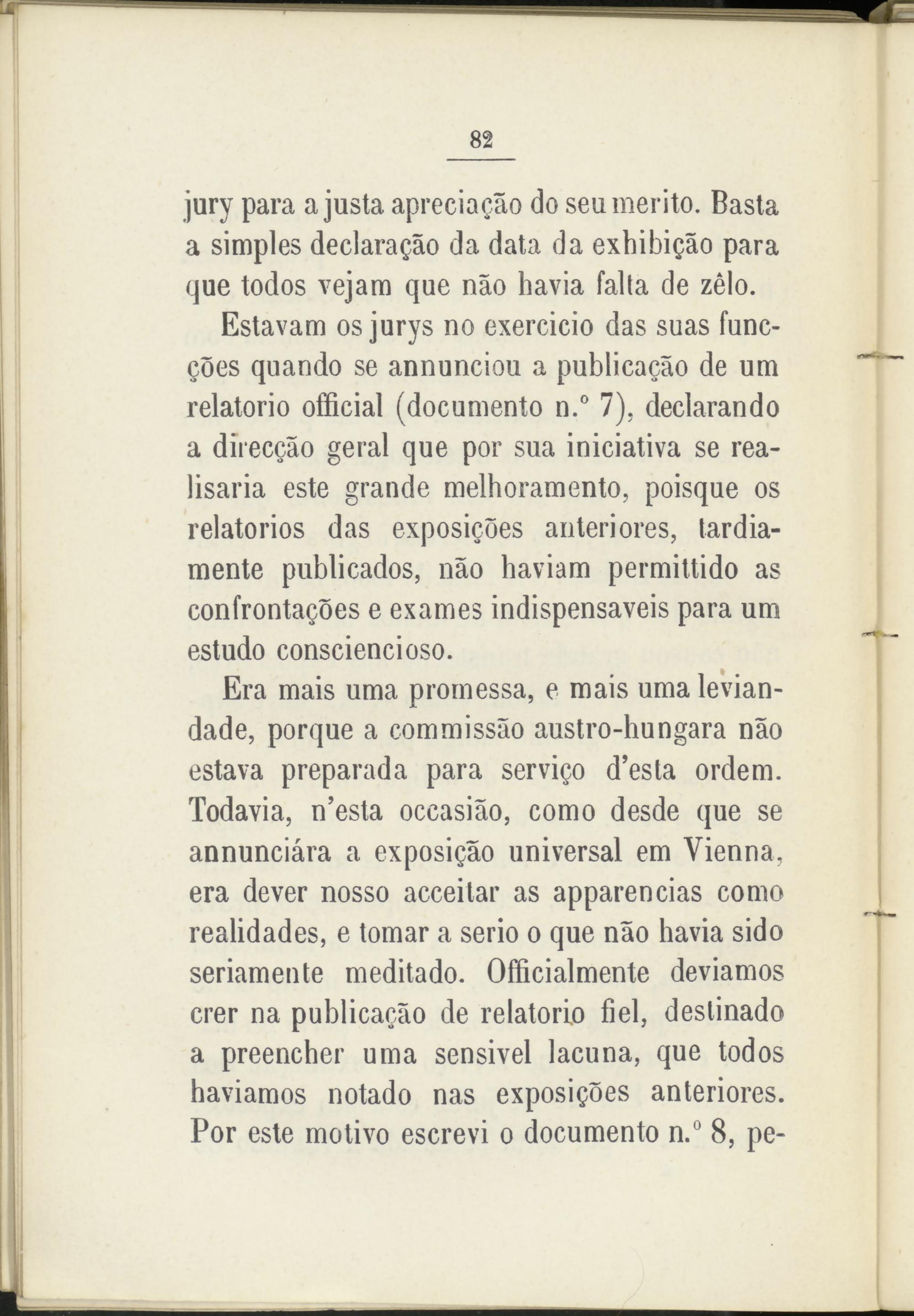 Era mais urna promessa, e mais urna levian- dade, porque a commissáo austro-hungara nao estava preparada para servido d’esta ordem. Todavía, n’esta oceasiao, como desde que se annunciára a exposigáo universal em Vienna, era dever nosso acceitar as apparencias como realidades, e tomar a serio o que nao havia sido seriamente meditado. Officialmente deviamos crer na publicacao de relatorio fiel, destinado a preencher urna sensivel lacuna, que todos haviamos notado ñas exposigoes anteriores. Por este motivo escrevi o documento n.° 8, pe-