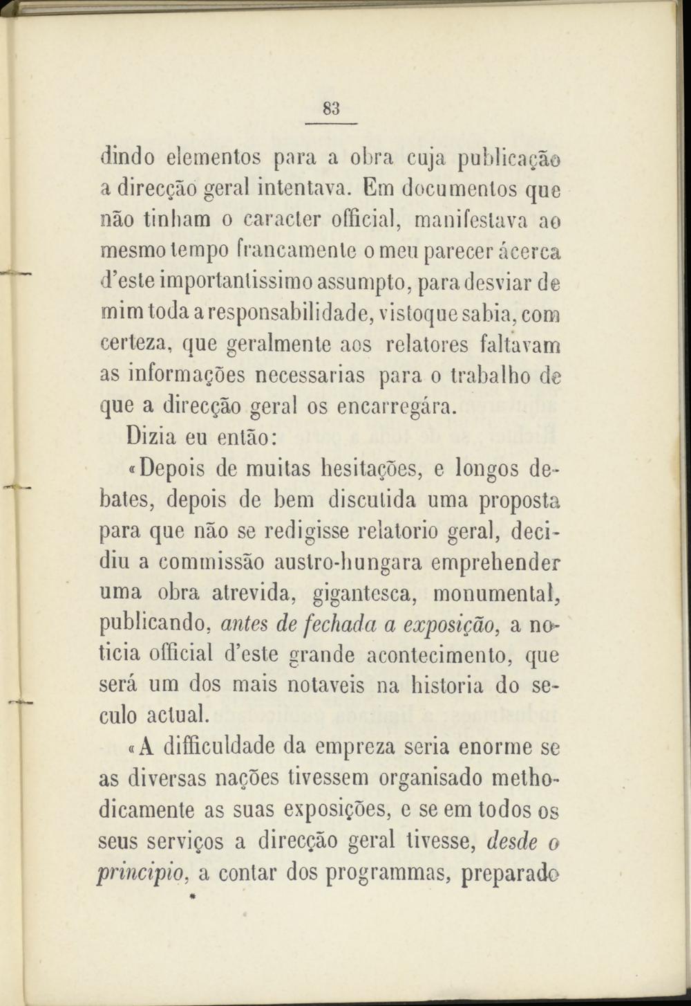 «Depois de muitas hesitagoes, e longos debates, depois de bem discutida urna proposta para que nao se redigisse relatorio geral, decidía a commissao auslro-hungara emprehender urna obra atrevida, gigantesca, monumental, publicando, antes de fechada a exposicáo, a no- ticia official d’este grande acontecimento, que será um dos mais notaveis na historia do secuto actual.