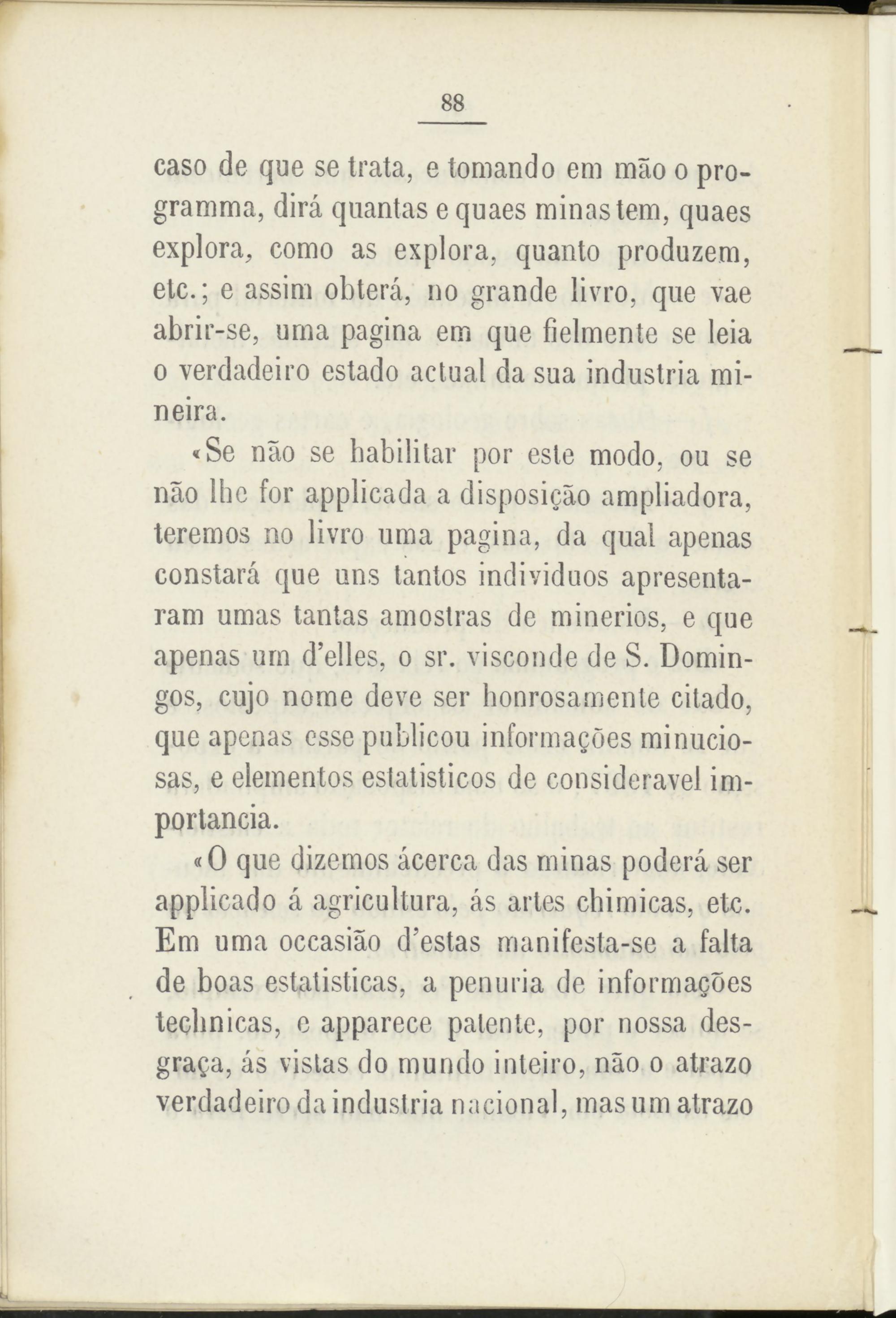 «Se nao se habilitar por este modo, ou se nao lhc for applicada a disposigáo ampliadora, teremos no livro urna pagina, da qual apenas constará que uns tantos individuos apresenta- ram urnas tantas amostras de minerios, e que apenas um d’elles, o sr. visconde de S. Domingos, cujo nome deve ser honrosamente citado, que apenas esse publicou infórmaseles minuciosas, e elementos estatisticos de consideravel importancia.