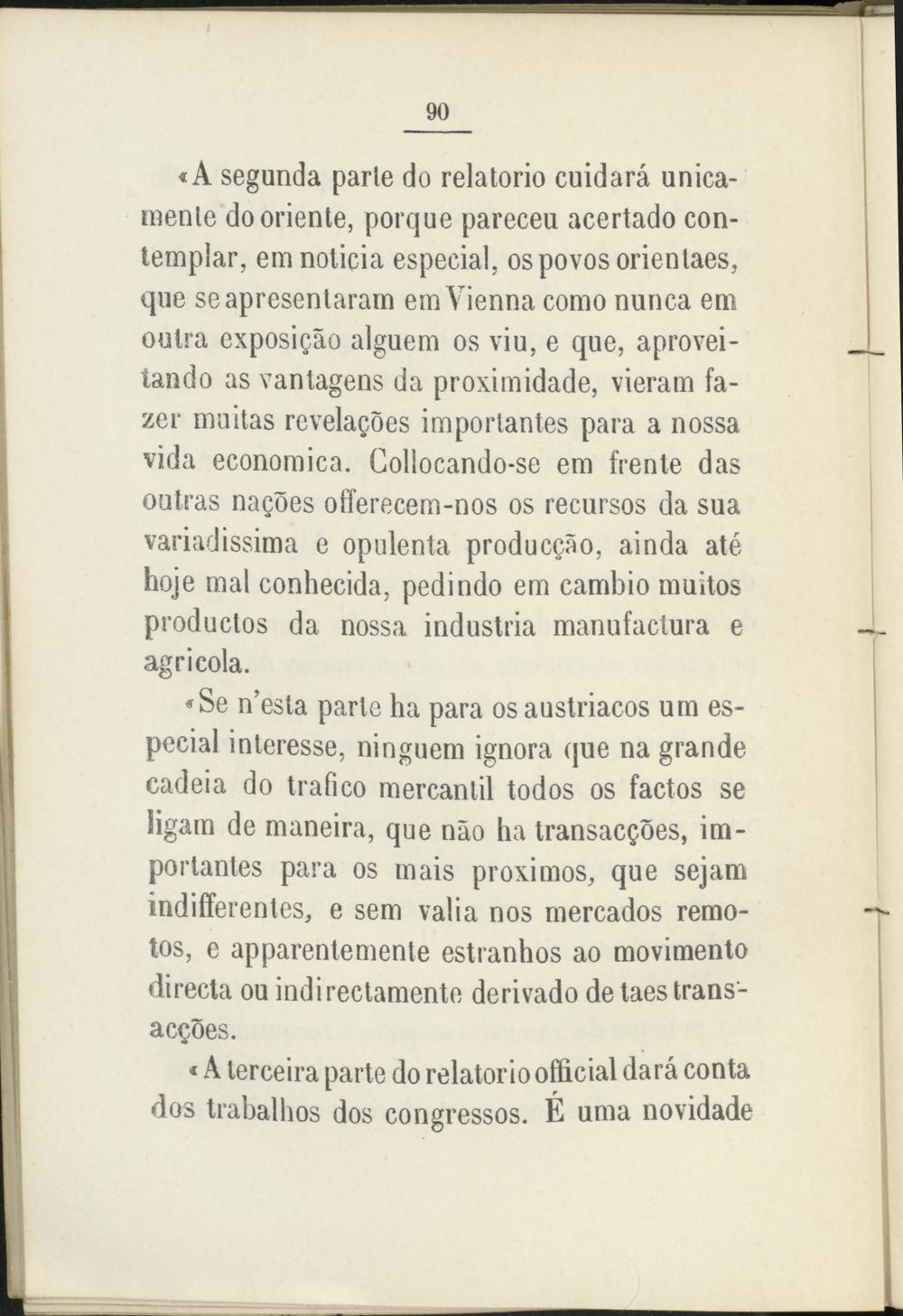«Se n’esía parte ha para os austriacos um especial inleresse, ninguem ignora que na grande cadeia do trafico mercantil todos os factos se ligam de maneira, que nao ha transacQoes, importantes para os mais próximos, que sejam indiferentes, e sem valia nos mercados remotos, e apparentemente estranhos ao movimento directa ou indirectamente derivado de taes transares.