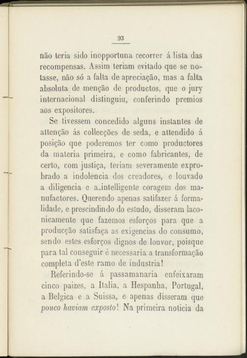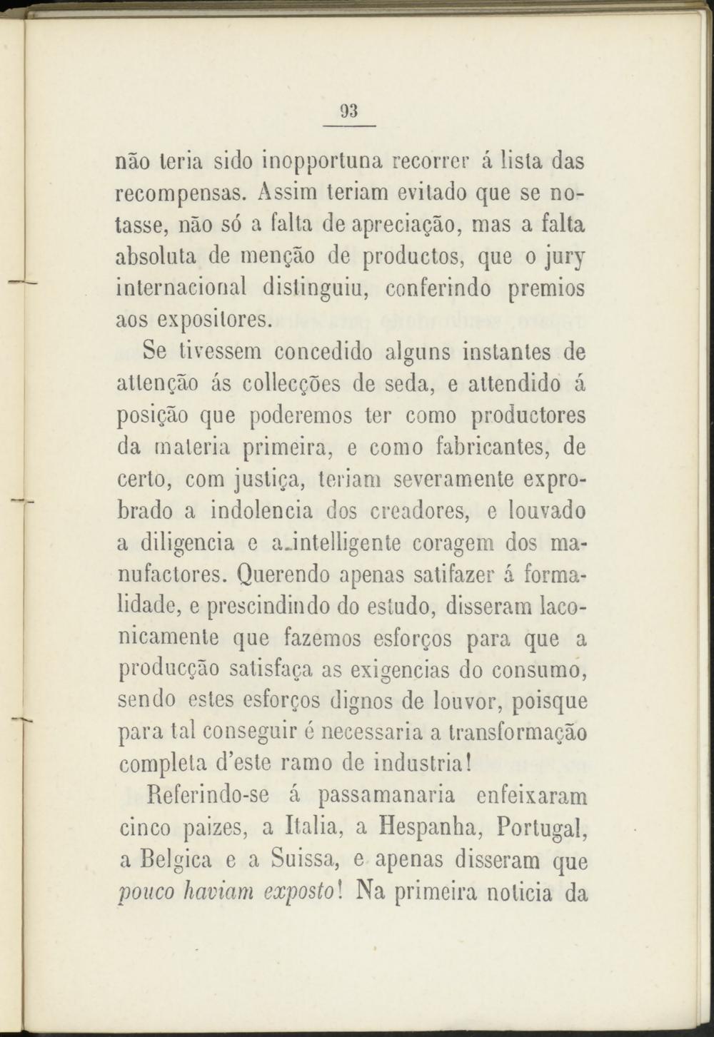 Referindo-se á passamanaria enfeixaram cinco paizes, a Italia, a Hespanha, Portugal, a Bélgica e a Suissa, e apenas disseram que pouco haviam expostol Na primeira noticia da