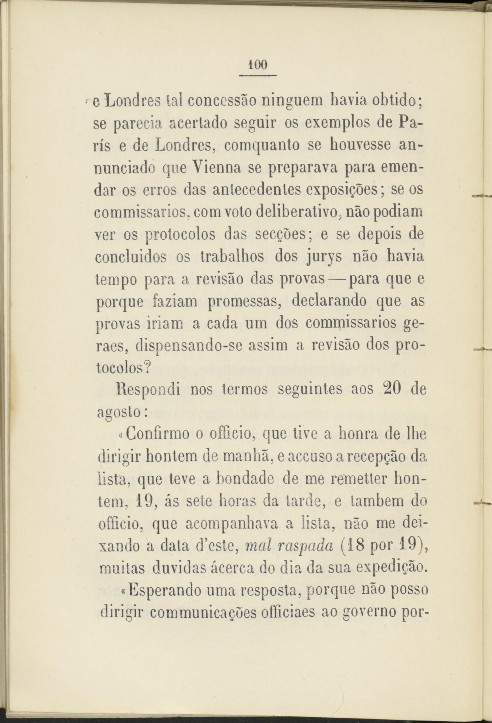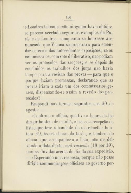 eLondres tal concessao ninguem havia obtido; se parecía acertado seguir os exemplos de París e de Londres, comquanto se houvesse an- nunciado que Yienna se preparava para emendar os erros das antecedentes exposigoes; se os commissarios, com voto deliberativo* nao podiam ver os protocolos das secgoes; e se depois de concluidos os trabalhos dos jurvs nao havia tempo para a revisáo das provas — para que e porque faziam promessas, declarando que as provas iriam a cada um dos commissarios ge- raes, dispensando-se assim a revisáo dos protocolos?