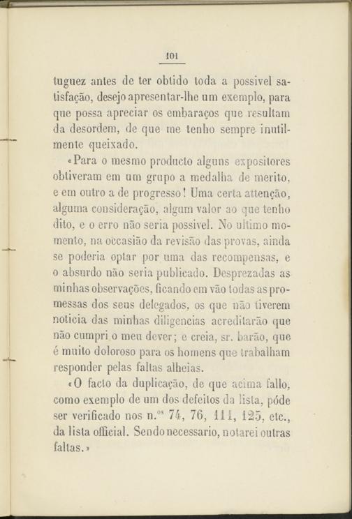 «Para o mesmo producto alguns expositores obtiveram era um grupo a raedalha de mérito, e era outro a de progresso! Urna certa attencáo, alguma consideragao, algara valor ao que tendió dito, e o erro nao seria possivel. No ultimo momento, na occasiáo da revisao das provas, ainda se poderia optar por urna das recompensas, e o absurdo nao seria publicado. Desprezadas as minhas observares, Picando era vao todas as pro- messas dos seus delegados, os que nao tiverem noticia das minhas diligencias acreditarlo que nao cumpri o mea dever; e creía, sr. barao, que é milito doloroso para os homens que trabalham responder pelas faltas alheias.