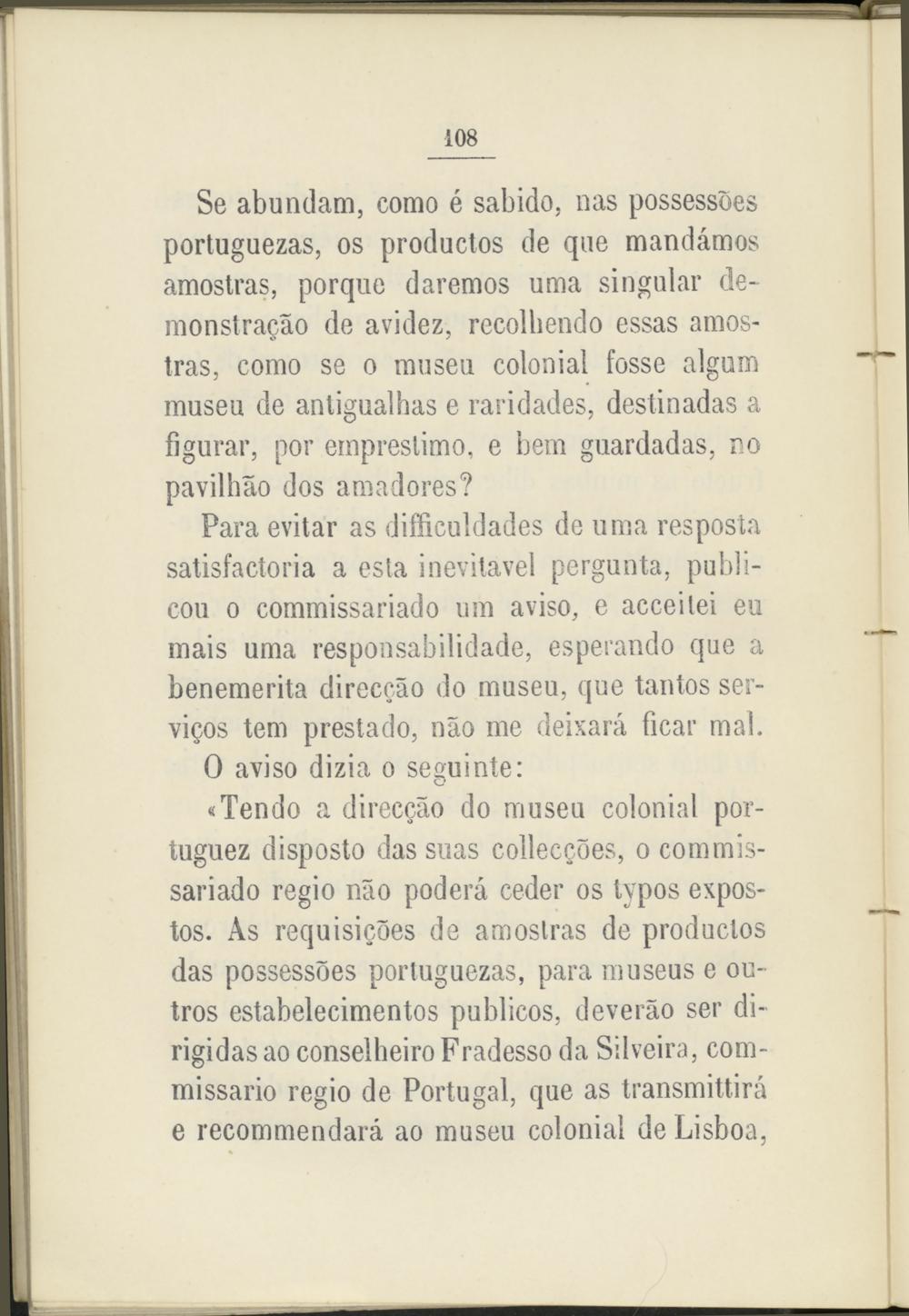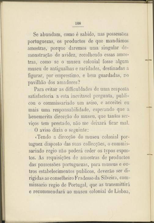 «Tendo a direccao do museu colonial por- tuguez disposto das suas eollecQoes, o commissariado regio nao poderá ceder os tvpos expos- tos. As requisigoes de amostras de productos das possessoes portuguezas, para museus e ou- tros estabelecimentos públicos, deverao ser dirigidas ao conselheiro Fradesso da Silveira, com- missario regio de Portugal, que as transmittirá e recommendará ao museu colonial de Lisboa,
