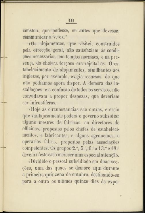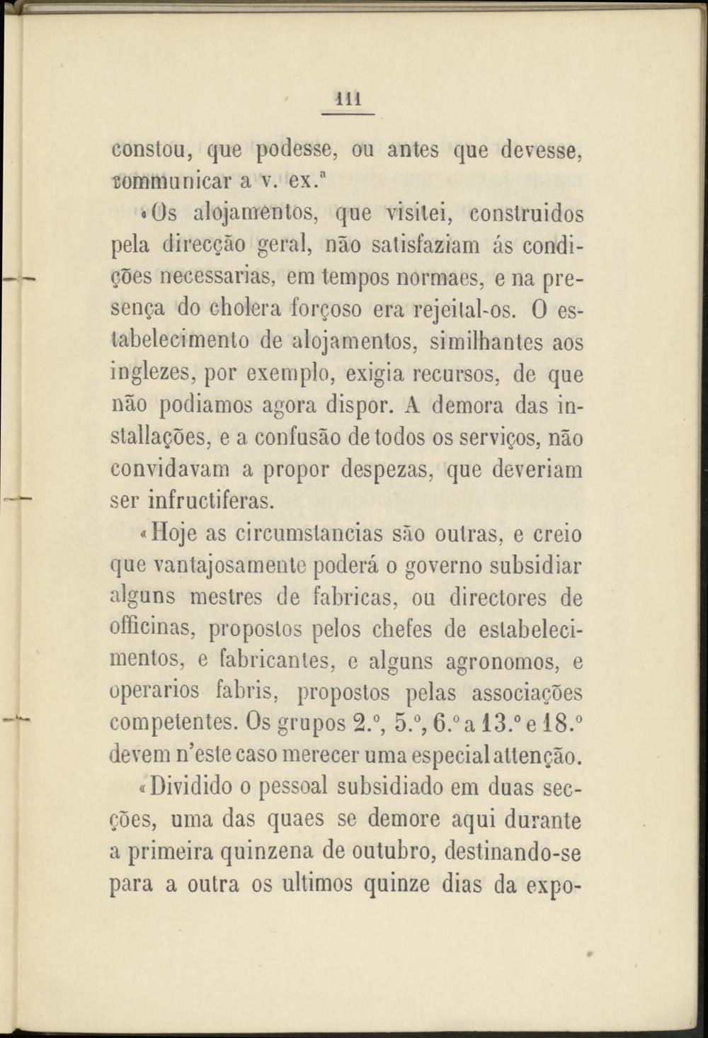 «Hoje as circumstancias sao oulras, e creio que vantaj osa mente poderá o governo subsidiar alguns mestres de fabricas, ou directores de officinas, proposlos pelos chefes de eslabeleci- mentos, e fabricantes, e alguns agrónomos, e operarios fabris, proposlos pelas associacóes competentes. Os grupos 2.°, 5.°, 6.° a 13.° e 18.° devem n’este caso merecer urna especial altengao.