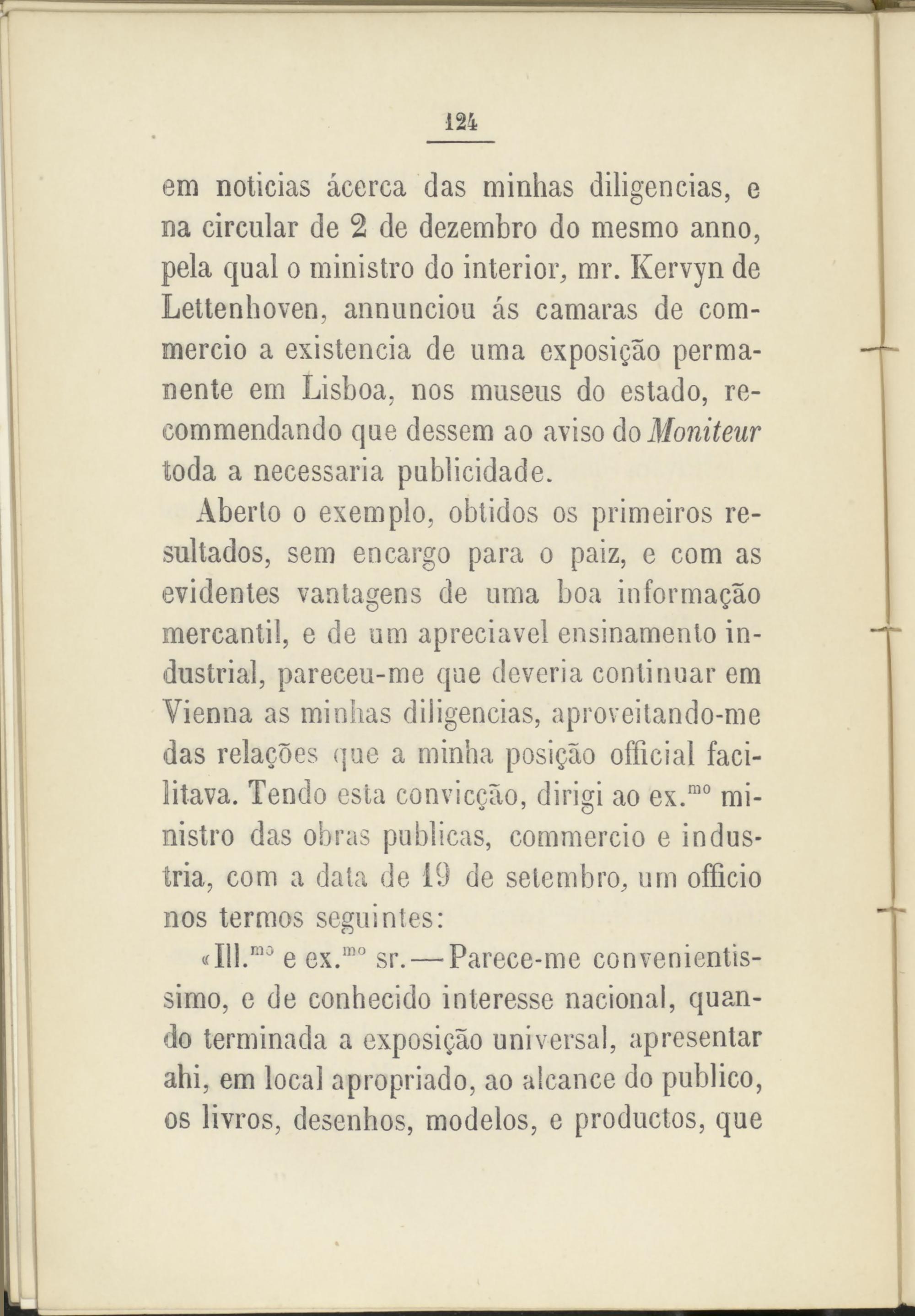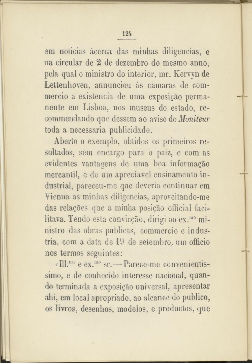 Aberto o exemplo, obtidos os primeiros resultados, sem encargo para o paiz, e com as evidentes vantagens de urna boa informagáo mercantil, e de um apreciavel ensinamento industrial, pareceu-me que deveria continuar em Vienna as minhas diligencias, aproveilando-me das relacóes que a minha posi§ao official faci- litava. Tendo esta conviccao, dirigi ao ex. m0 ministro das obras publicas, commercio e industria, com a data de 19 de setembro, um oñicio nos termos seguintes: