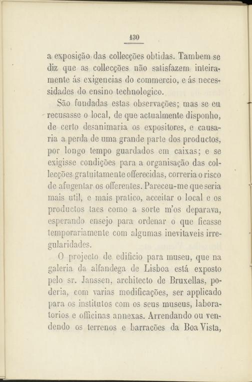 O projecto de edificio para museu, que na galería da alfandega de Lisboa está exposto pelo sr. Janssen, arcbitecto de Bruxellas, po- deria, com varias modificares, ser applicado para os institutos com os seus museus, laboratorios e ofíicinas annexas. Arrendando ou ven- dendo os terrenos e barracoes da Boa Vista,
