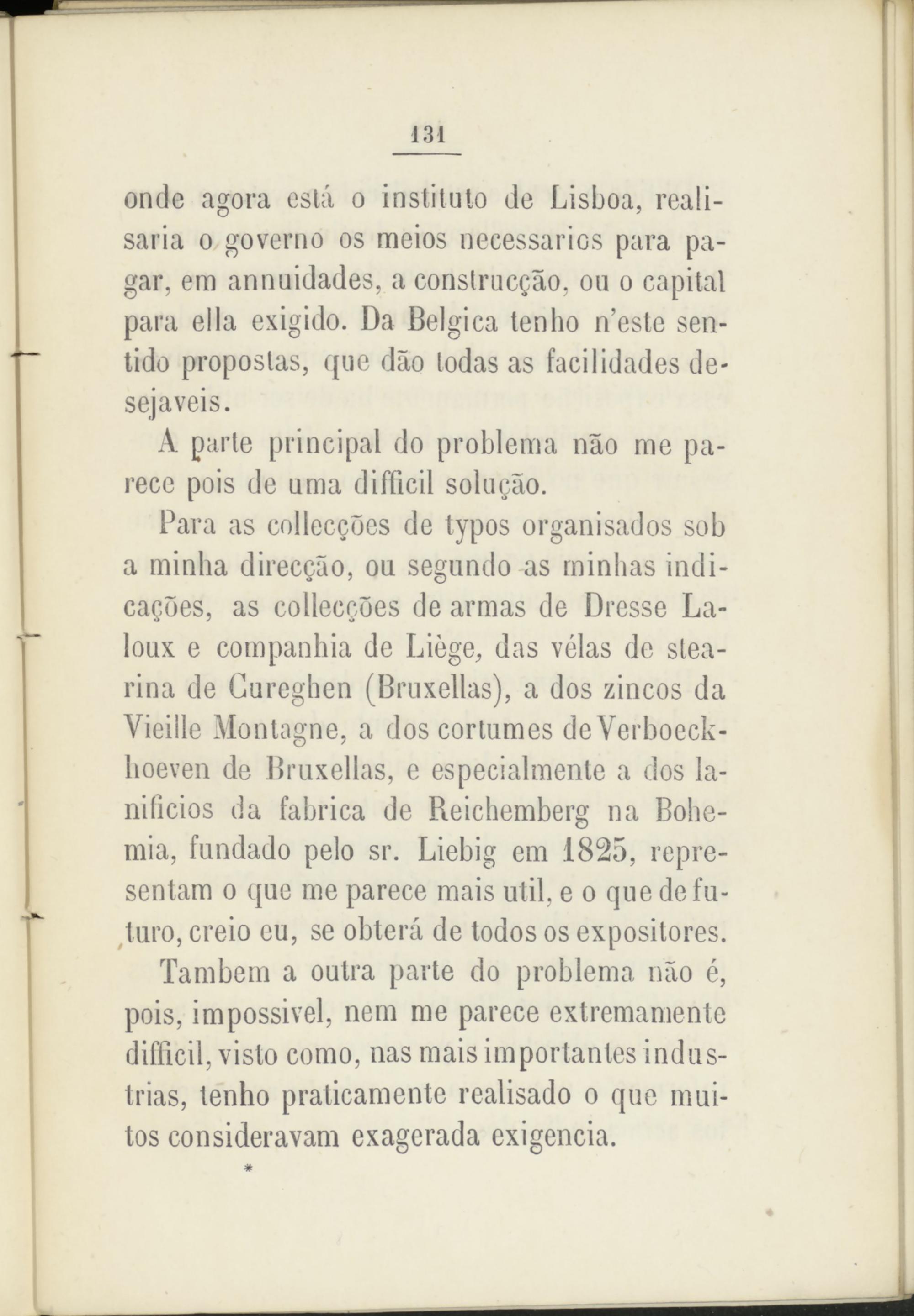 Para as collecQóes de typos organisados sob a rninha direcgao, ou segundo as minlias indi- cagoes, as collecQües de armas de Drcsse La- loux e companhia de Liége, das velas de slea- rina de Cureghen (Bruxellas), a dos zincos da Vieille Montagne, a dos cortumes deVerboeck- lioeven de Bruxellas, e especialmente a dos lanificios da fabrica de Reichemberg na Bohemia, fundado pelo sr. Liebig cm 1825, representara o que me parece mais útil, e o que de fu- juro, creio eu, se obterá de todos os expositores.