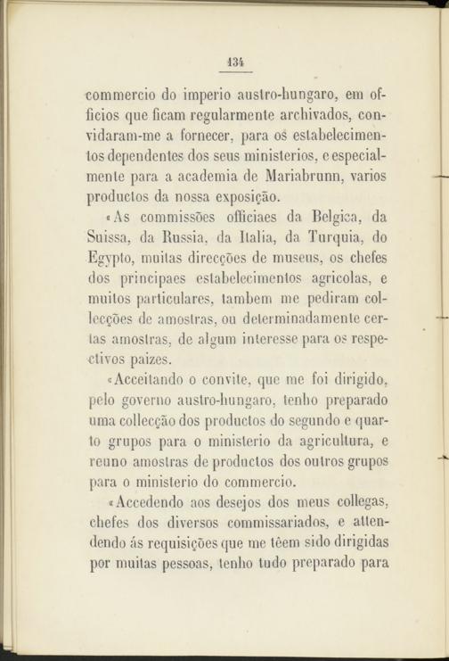 «Acceitando o convite, que me foi dirigido, pelo governo austro-bungaro, tenbo preparado urna collecgao dos productos do segundo e quar- to grupos para o ministerio da agricultura, e reúno amostras de productos dos outros grupos para o ministerio do commercio.