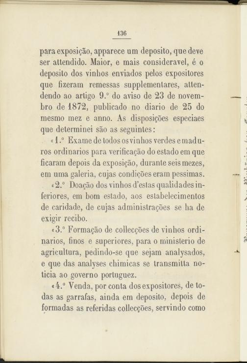 «3.° Formagáo de collecgoes de vinhos ordinarios, finos e superiores, para o ministerio de agricultura, pedindo-se que sejam analysados, e que das analyses chimicas se transmitía noticia ao governo portuguez.
