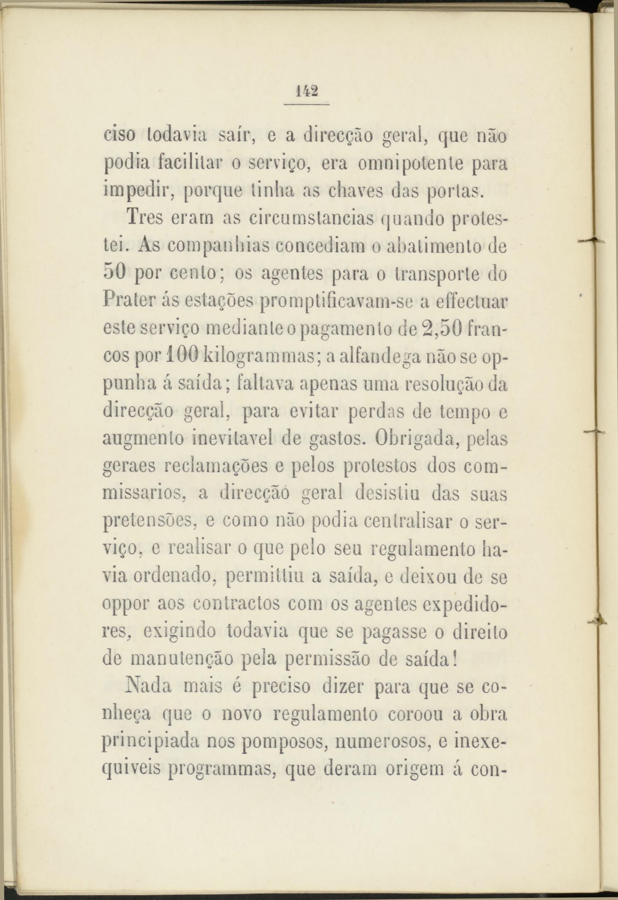 Tres erarn as circumslancias quando proteste!*. As companhias concediam o abalimenlo de 50 por cenlo; os agentes para o transporte do Prater ás estagoes promplificavam-se a effeetuar este servigo mediante o pagamento de 2,50 francos por 100 kilogrammas; a alfandega nao se op- punha á salda; faltava apenas urna resolugao da direcgáo geral, para evitar perdas de tempo e augmento inevilavel de gastos. Obrigada, pelas geraes reclamagoes e pelos protestos dos com- missarios, a direcgáo geral desisliu das suas pretensoes, e como nao podia cenlralisar o ser- vigo, e realisar o que pelo seu regulamento ha- via ordenado, permittiu a salda, e deixou de se oppor aos contractos com os agentes expedidores, exigindo todavía que se pagasse o direilo de manutencao pela permissao de salda!