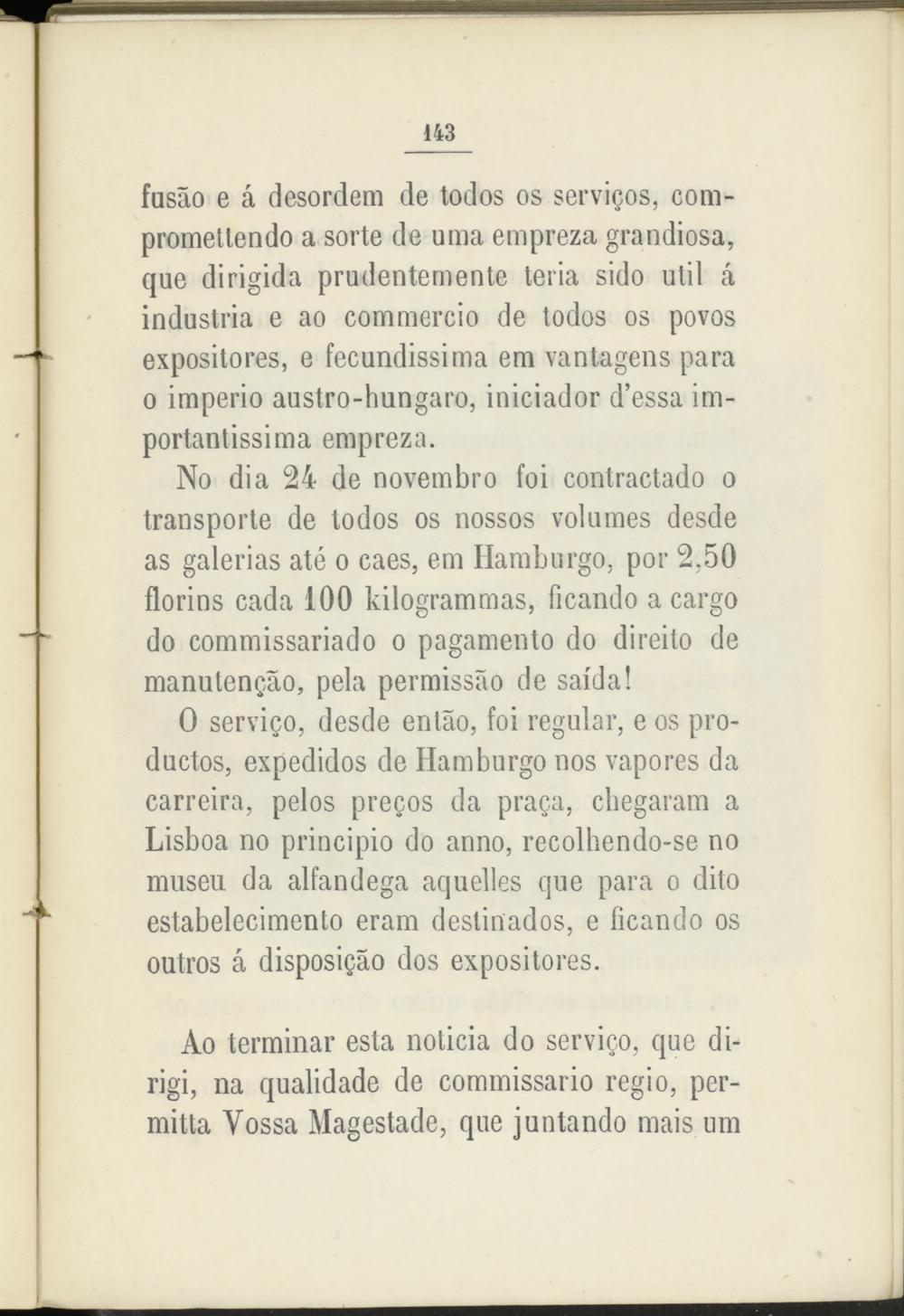 No di a 24 de novembro foi contractado o transporte de todos os nossos volumes desde as galerias até o caes, em Hamburgo, por 2.50 florins cada 100 kilogrammas, ficando a cargo do commissariado o pagamento do direito de manutengao, pela permissao de salda!
