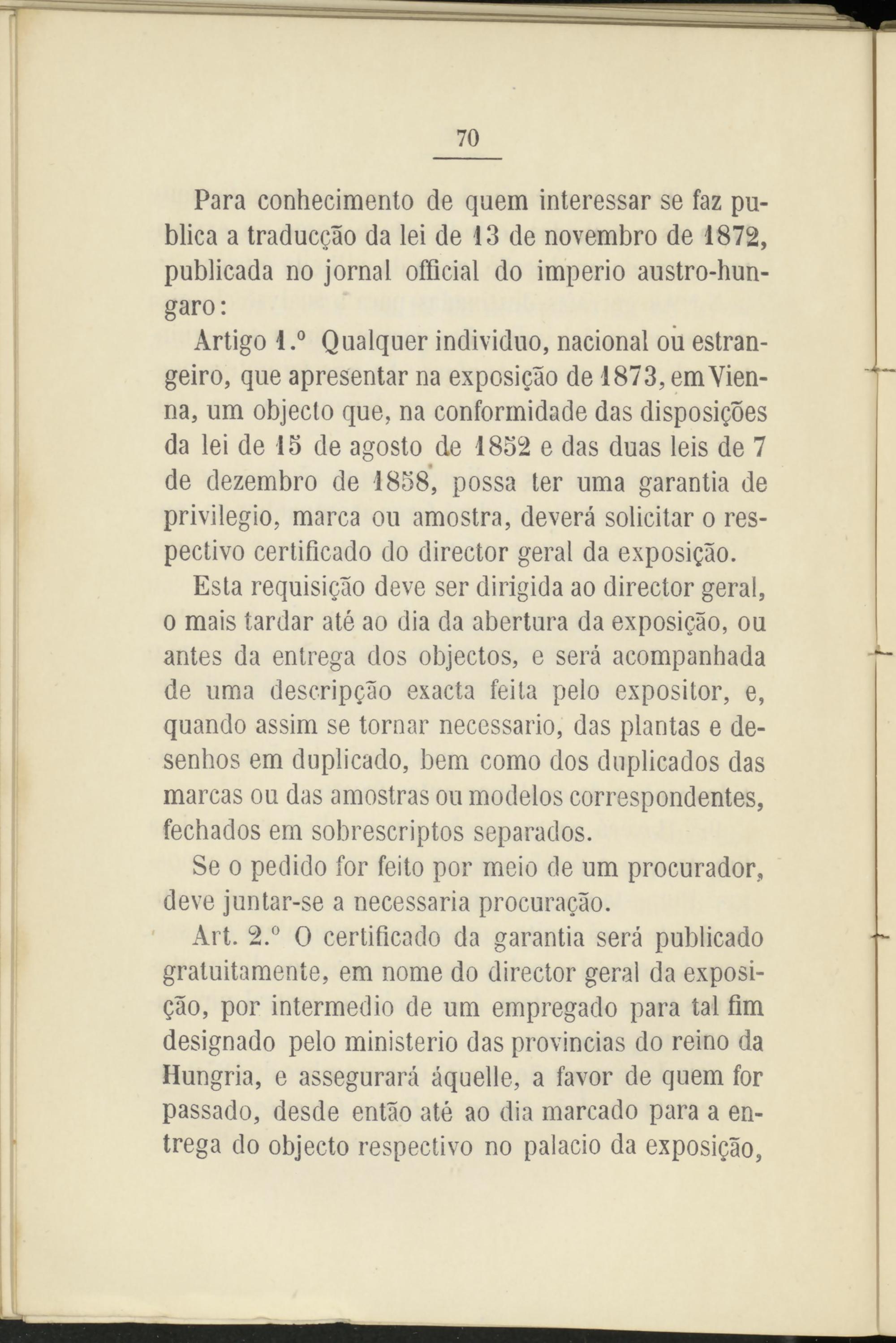 Artigo l.° Qualquer individuo, nacional ou estran- geiro, que apresentar na exposigáo de 1873,emVien- na, um objeclo que, na conformidade das disposigoes da lei de 13 de agosto de 1832 e das duas leis de 7 de dezembro de 1838, possa ter urna garantía de privilegio, marca ou amostra, deverá solicitar o respectivo certificado do director geral da exposigáo.