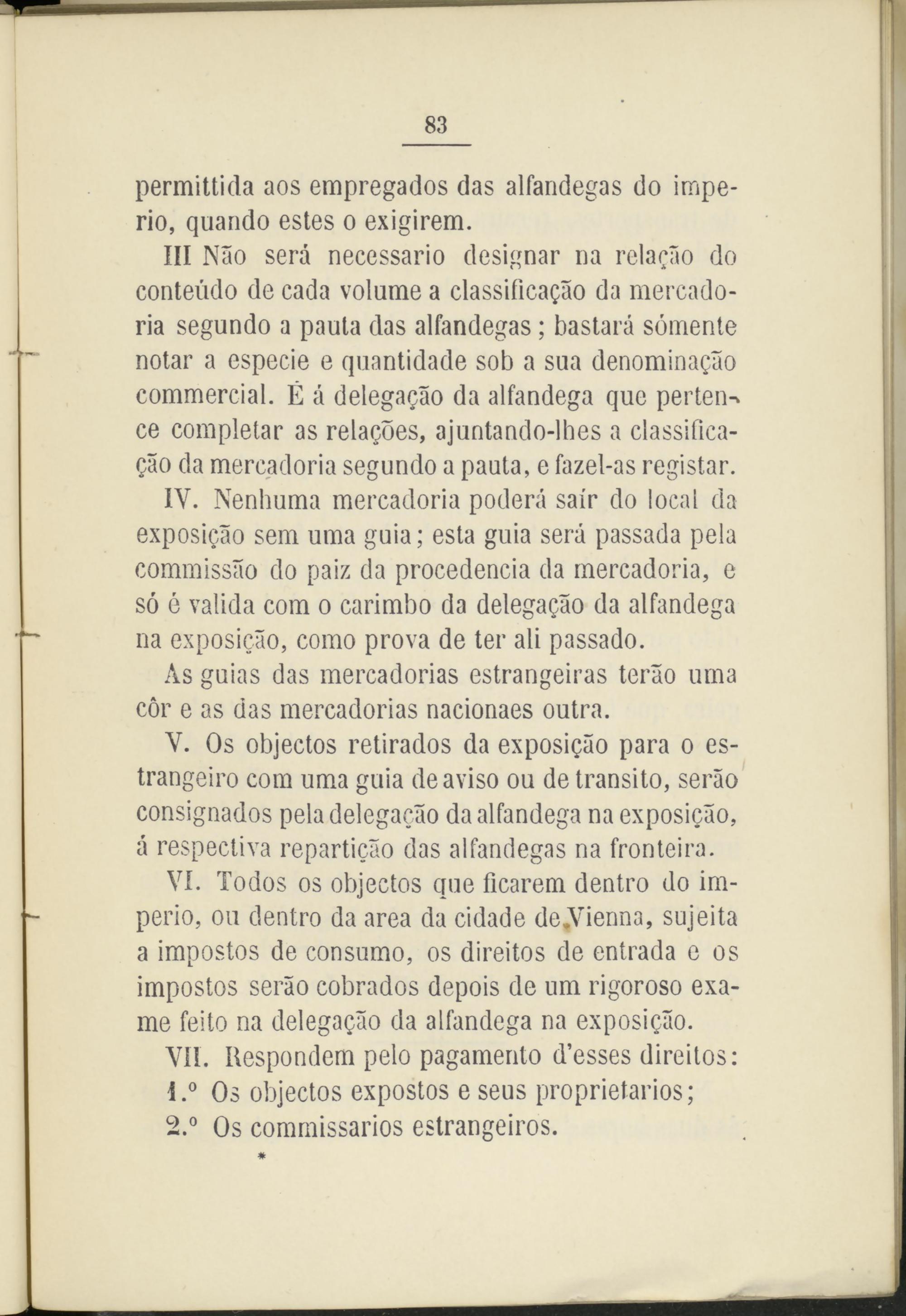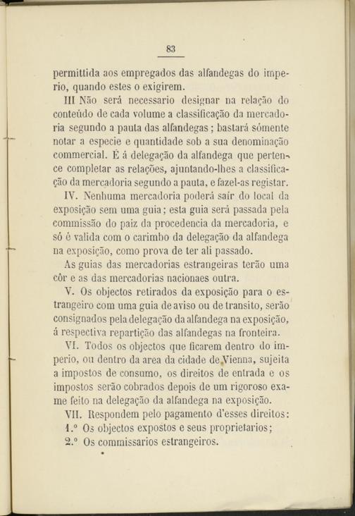 VI. Todos os objectos que ficarem dentro do imperio, ou dentro da area da cidade de,Vienna, sujeita a impostos de consumo, os direitos de entrada e os impostos seráo cobrados depois de um rigoroso exame feito na delegagao da alfandega na exposigáo.