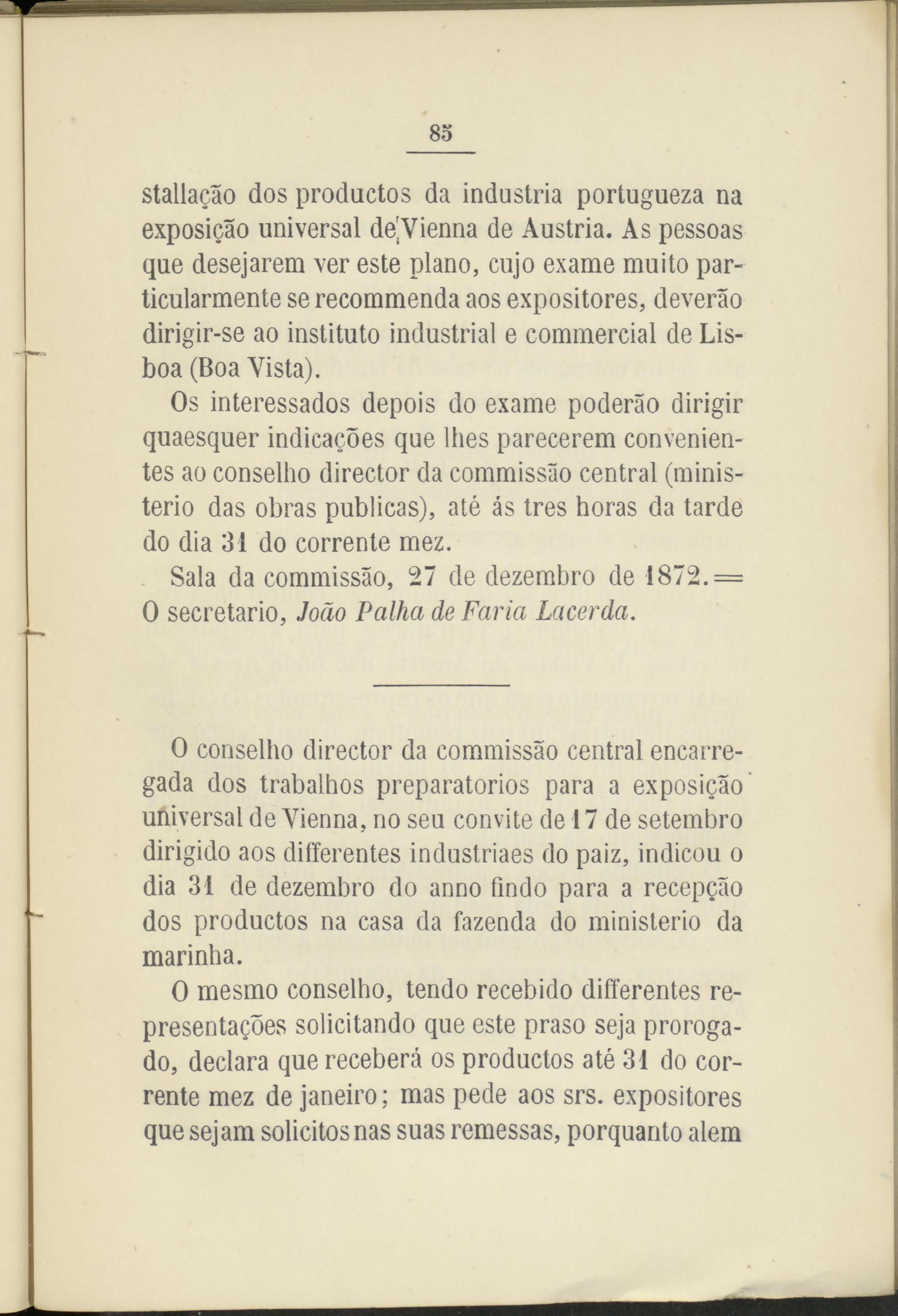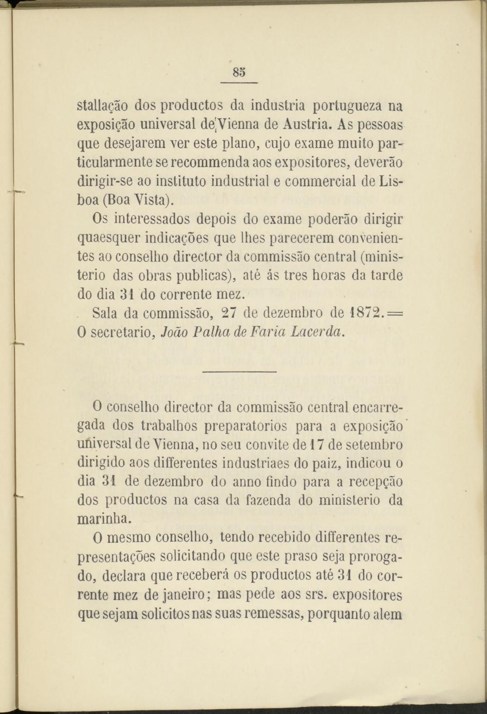 staliagáo dos productos da industria portugueza na exposigao universal de'Vienna de Austria. As pessoas que desejarem ver este plano, cujo exame muito particularmente se recommenda aos expositores, deveráo dirigir-se ao instituto industrial e commercial de Lisboa (Boa Vista).