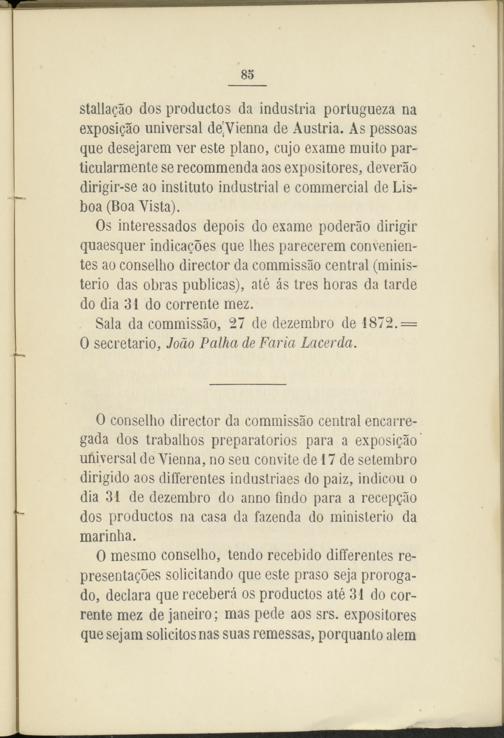 O conselho director da commissáo central encarre- gada dos trabalhos preparatorios para a exposigao" universal de Vienna, no seu convite de 17 de setembro dirigido aos differentes industriaes do paiz, indicou o dia 31 de dezembro do anno findo para a recepgáo dos productos na casa da fazenda do ministerio da marinha.