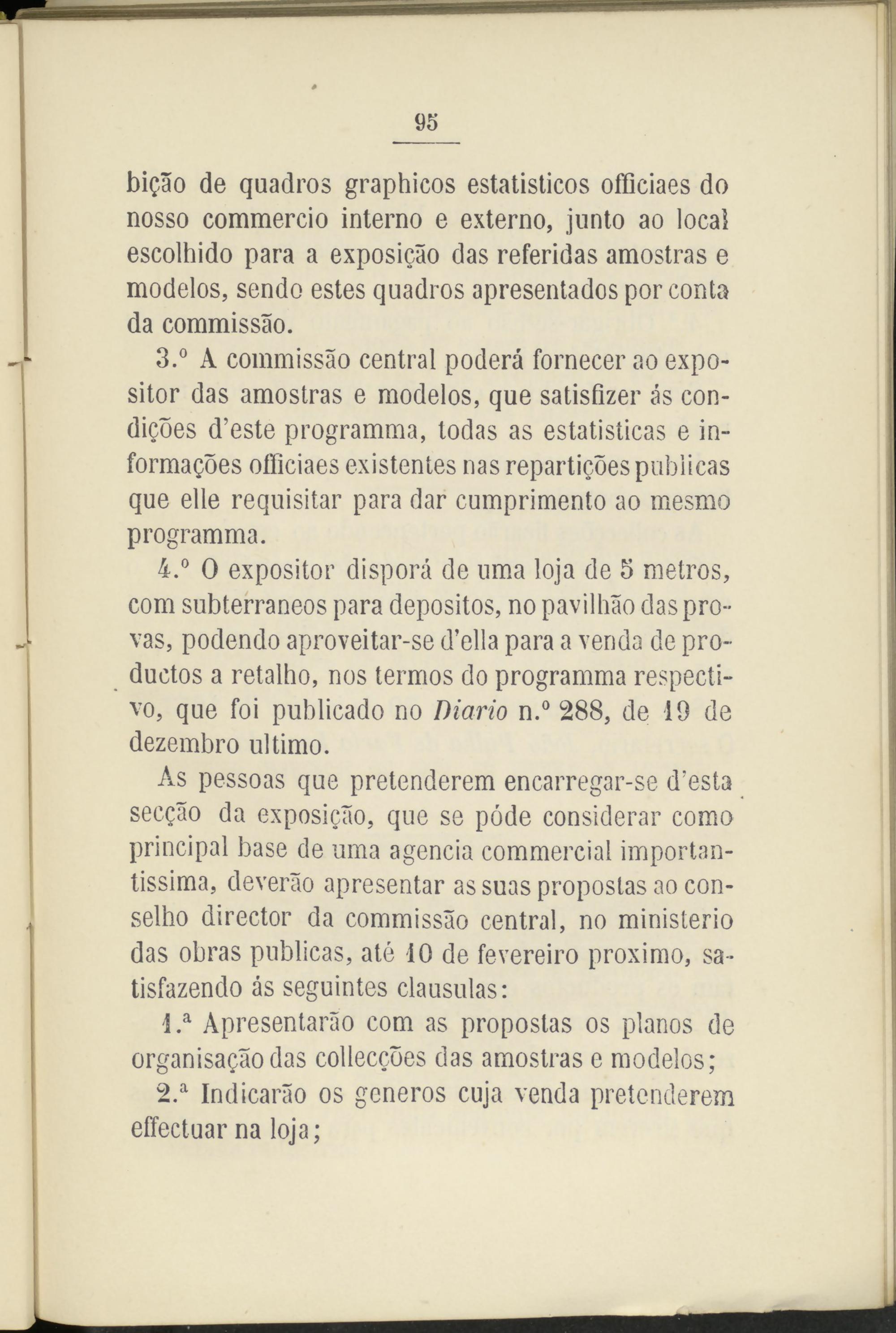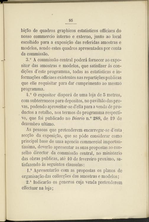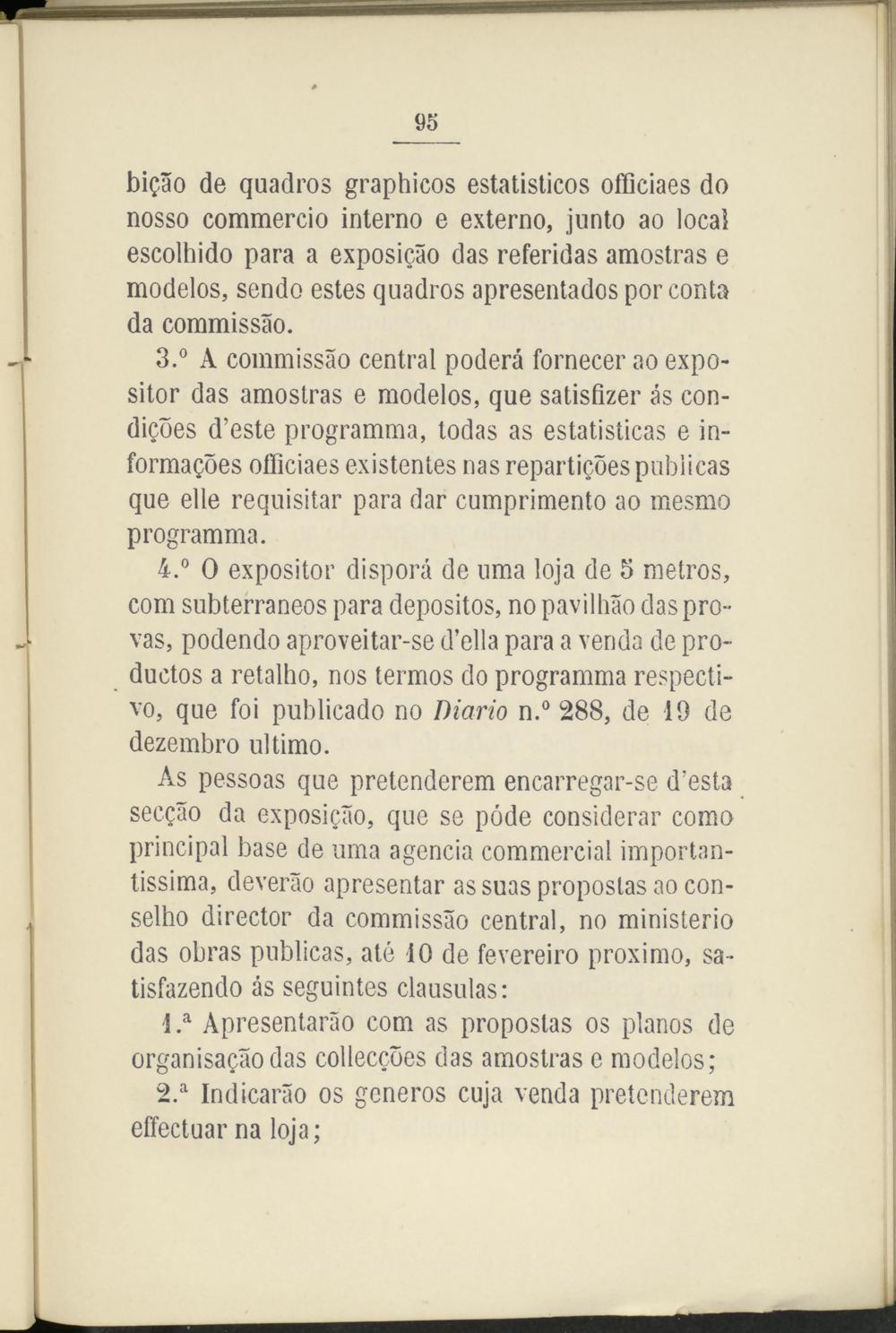 3. ° A commissáo central poderá fornecer ao expositor das amostras e modelos, que satisfizer ás conduces d’este programma, todas as estatisticas e in- formaQoes officiaes existentes ñas repartieres publicas que elle requisitar para dar cumprimento ao mesmo programma.