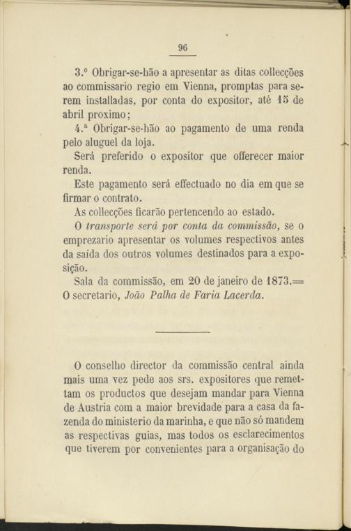 3. ° Obrigar-se-háo a apresentar as ditas collecgoes ao commissario regio em Vienna, promptas para serení installadas, por conta do expositor, até 15 de abril próximo;