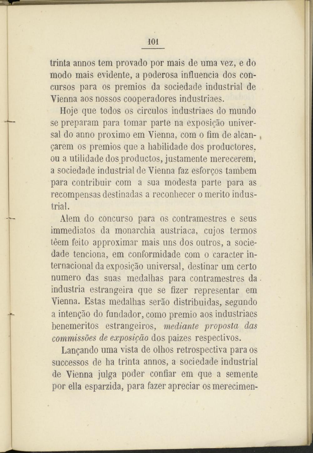 Alem do concurso para os contramestres e seus immediatos da monarchia austríaca, cujos termos téem feito approximar mais uns dos outros, a sociedade tenciona, em conformidade com o carácter internacional da exposigáo universal, destinar um certo numero das suas medalhas para contramestres da industria estrangeira que se fizer representar em Vienna. Estas medalhas serao distribuidas, segundo a intengao do fundador, como premio aos industriaes beneméritos estrangeiros, mediante proposta das commissóes de exposicáo dos paizes respectivos.