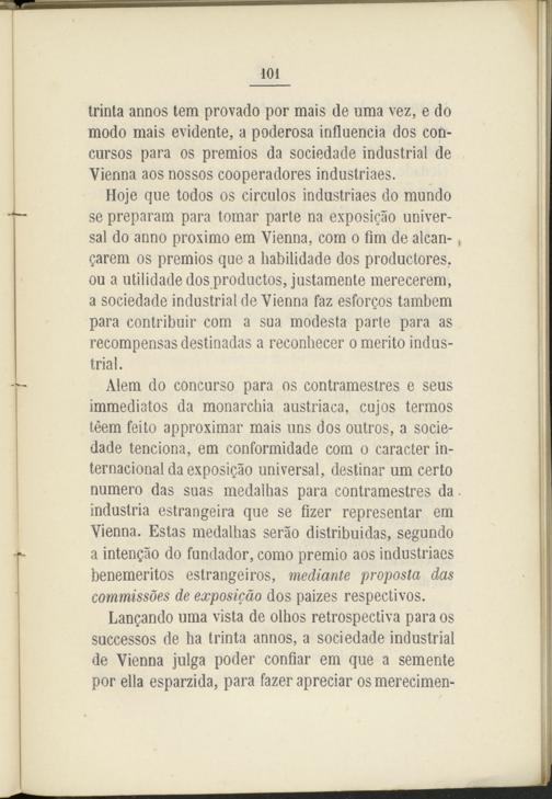 Hoje que todos os circuios industriaes do mundo se preparam para tomar parte na exposicáo universal do anno próximo em Vienna, com o fim de alean-, §arem os premios que a habilidade dos productores, ou a utilidade dos productos, justamente merecerem, a sociedade industrial de Vienna faz esforcos tambem para contribuir com a sua modesta parte para as recompensas destinadas a reconhecer o mérito industrial.