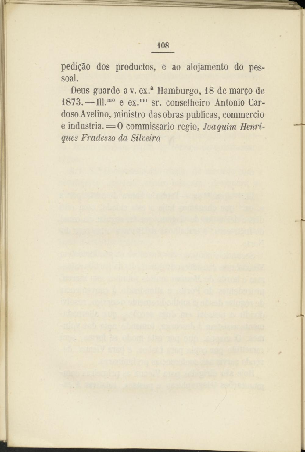 Deus guarde a v. ex. a Hamburgo, 18 de margo de 1873. — Ill. ra0 e ex. mo sr. conselheiro Antonio Cardóse Avelino, ministro das obras publicas, commercio e industria. = O commissario regio, Joaquim Henri- ques Fradesso da Silveira