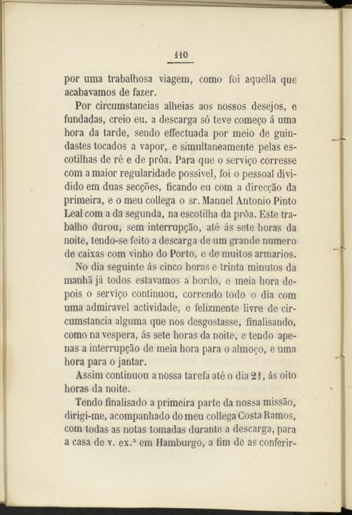 Tendo finalisado a primeira parte da nossa missáo, dirigi-me, acompanhado do meu collega Costa Ramos, com todas as notas tomadas durante a descarga, para a casa de v. ex. a em Hamburgo, a fim de as conferir-
