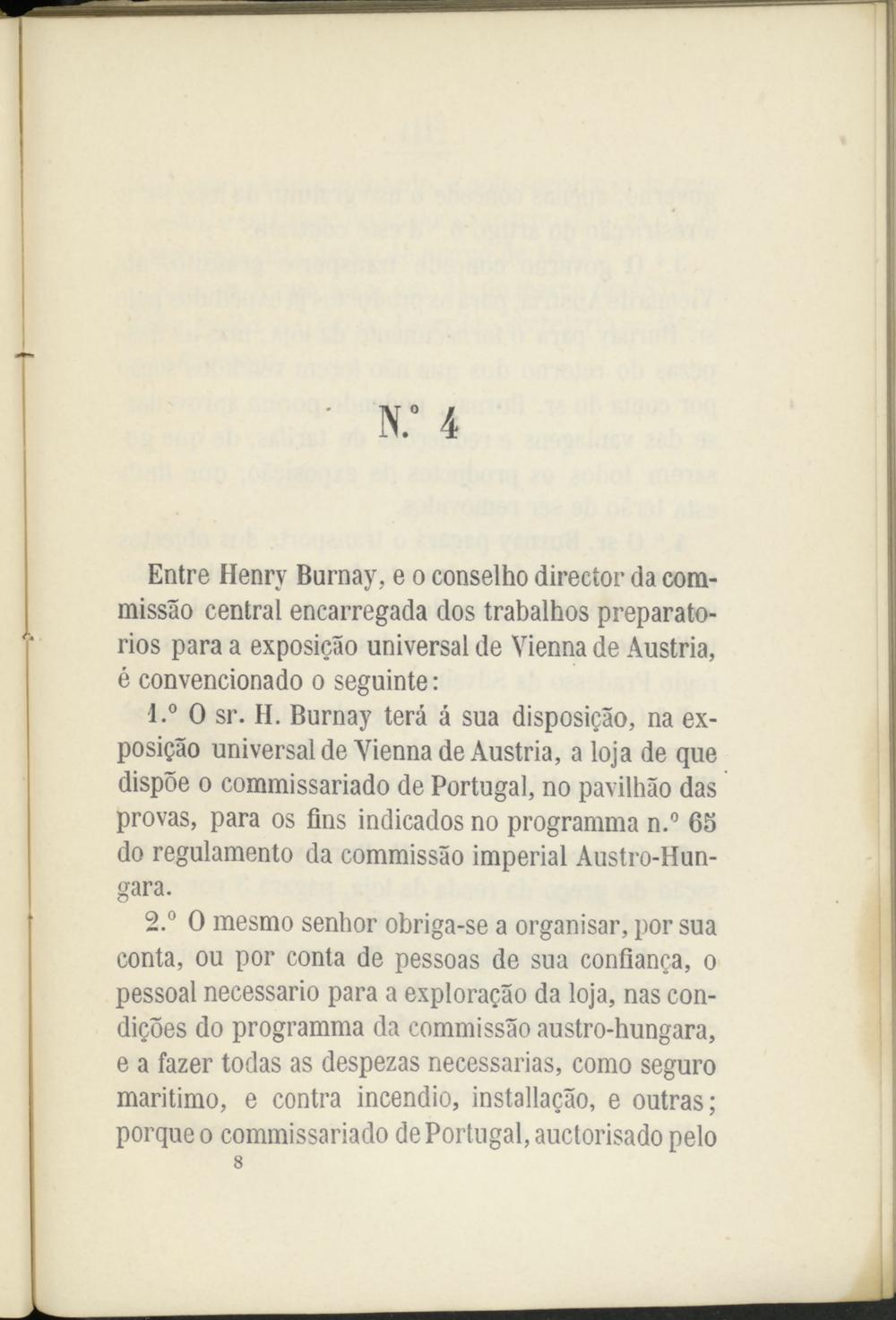 1. ° O sr. H. Burnay terá á sua disposigao, na ex- posigao universal de Yienna de Austria, a loja de que dispoe o commissariado de Portugal, no pavilháo das provas, para os fins indicados no programma n.° 65 do regulamento da commissáo imperial Austro-Hun- gara.