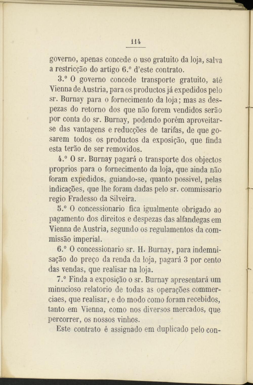 3. ° O governo concede transporte gratuito, até Yienna de Austria, para os productos já expedidos pelo sr. Burnay para o fornecimento da loja; mas as des- pezas do retorno dos que nao forem vendidos será o por conta do sr. Burnay, podendo porém aproveitar- se das vantagens e reducgoes de tarifas, de que go- sarem todos os productos da exposigáo, que finda esta teráo de ser removidos.