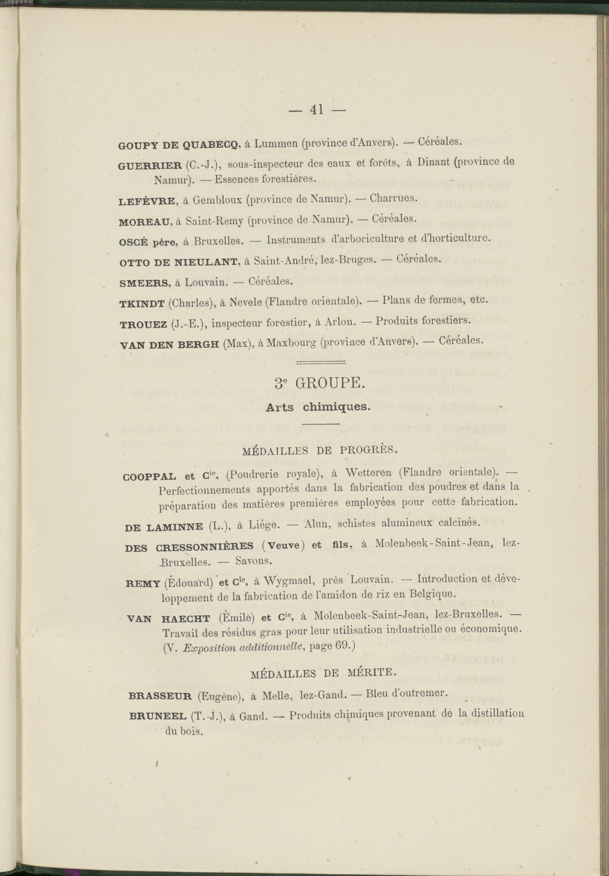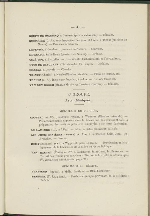 TKINDT (Charles), à Ncvele (Flandre orientale). — Plans de fermes, etc. TROUEZ (J.-E.), inspecteur forestier, à Arlon. — Produits forestiers.