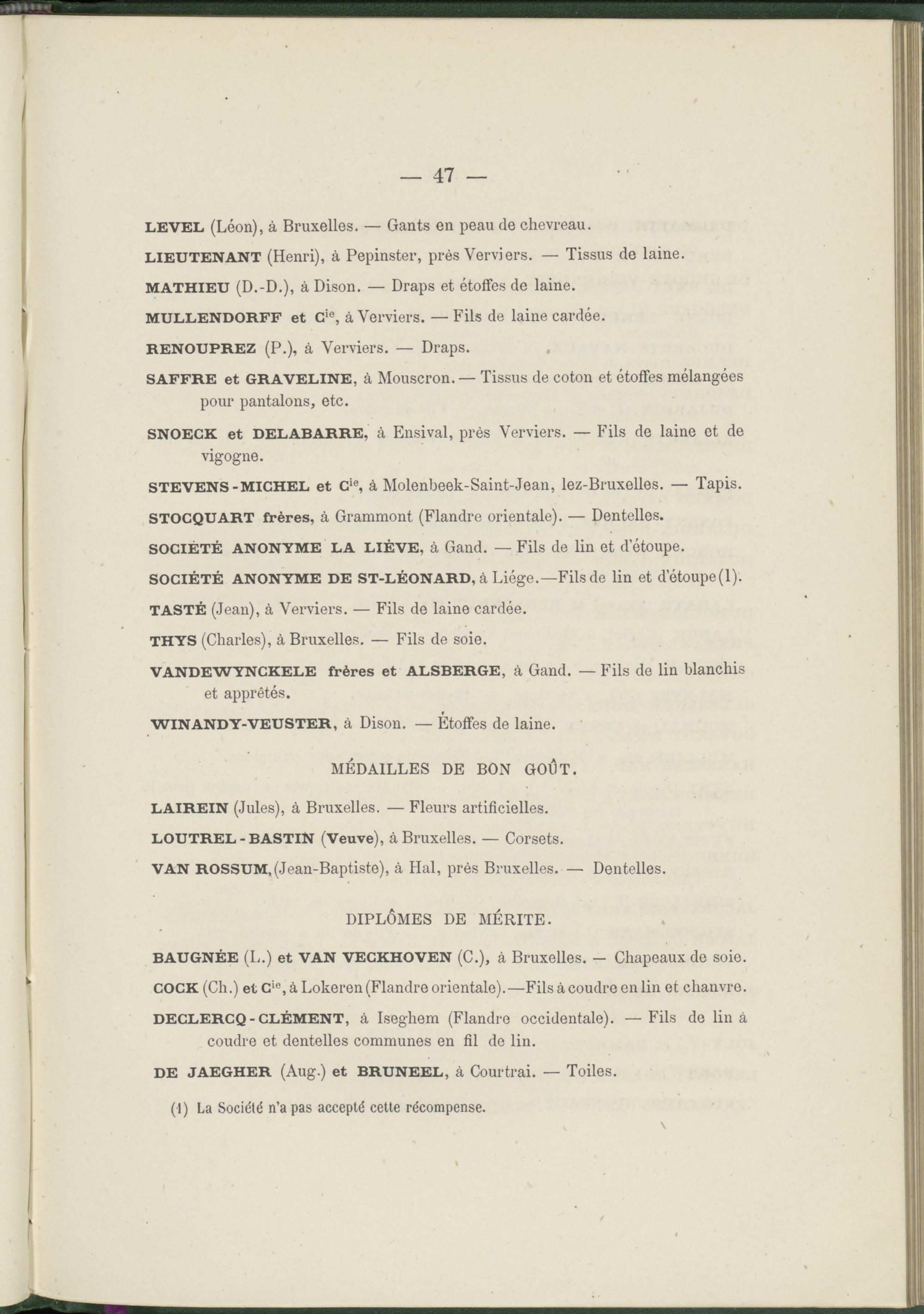 SOCIÉTÉ ANONYME LA LIÈVE, à Gand. — Fils de lin et d’étoupe. SOCIÉTÉ ANONYME DE ST-LÉONARD, à Liège.— Fils de lin et d’étoupe (1). TASTÉ (Jean), à Verviers. — Fils de laine cardée.