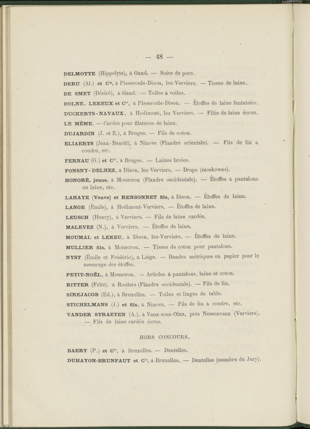 DOLNE, LEKEUX et C ie , à Pisseroule-Dison. — Étoffes de laine fantaisies. DUCKERTS-NAVAUX, à Hodimont, lez Verviors. — Filés de laine écrue. LE MÊME. — Cardes pour filatures de laine.